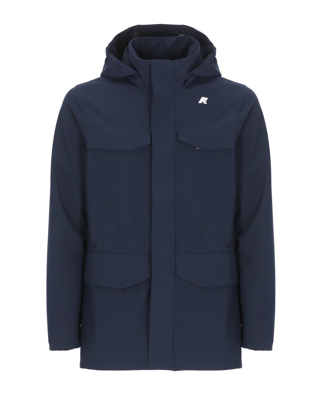 - Blue K-Way jacket for man - Hood - Long sleeves - Four front flap pockets - Front contrasting color iconic logoed patch - Front zip and snap buttons fastening