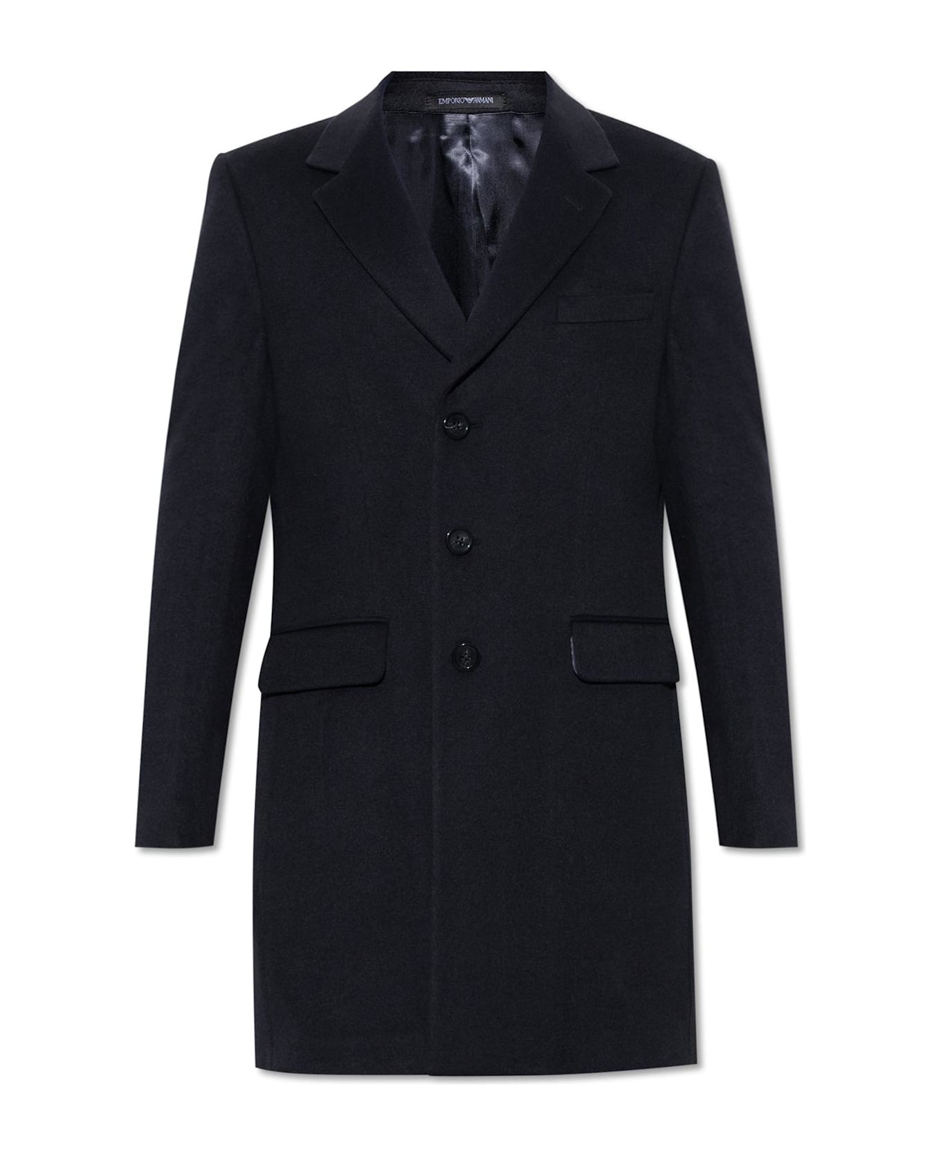 Navy coat with notch lapels from Emporio Armani. Made of cashmere, this design features buttons, three pockets on the front, two with flaps, long sleeves and a single slit at the back. Composition: Outer Layer: 100% Cashmere Inner Layer: 100% Viscose Composition: Fabric : Cashmere, 100% - Lining : Viscos
