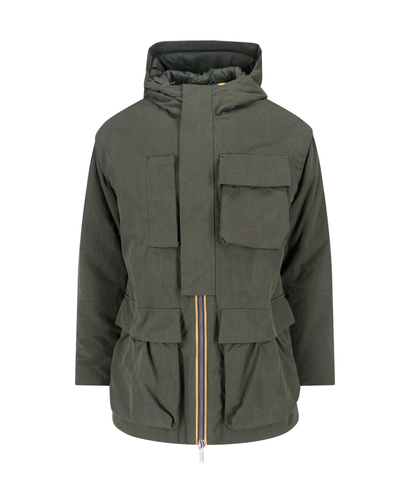 K-way 'Gulliermo' jacket in green fabric with drawstring hood, double zip closure, four front pockets, multicolor logo on the front, Primaloft® details, inner zip pocket, inner flat pocket, straight hem.