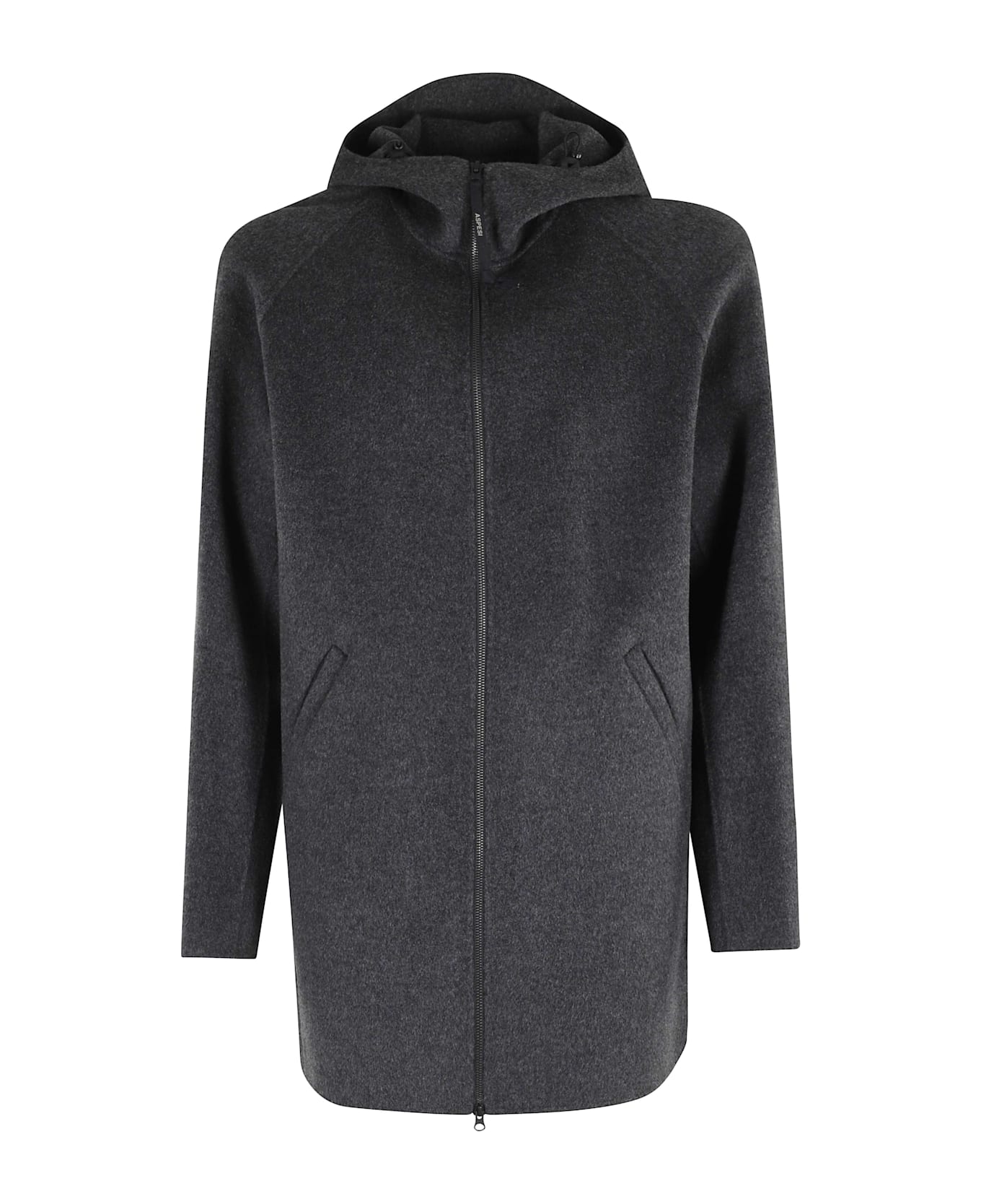 Super Doppel Coat -Expended -Colored charcoal -Cap -Long sleeve -Center closure with double-slider zipper -Side pockets