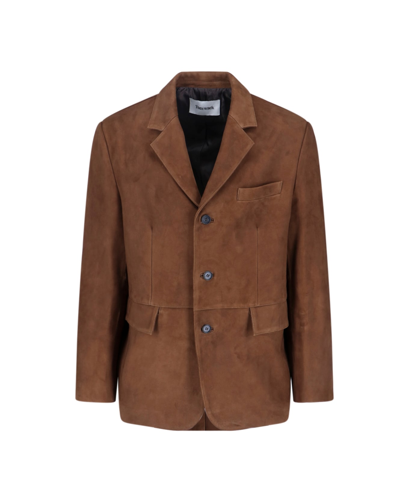 Tony Wack brown single-breasted suede blazer with classic lapels, button closure, chest pocket, two front flap pockets, button cuffs, central back vent, straight hem. Composition: 100% Goat Leather