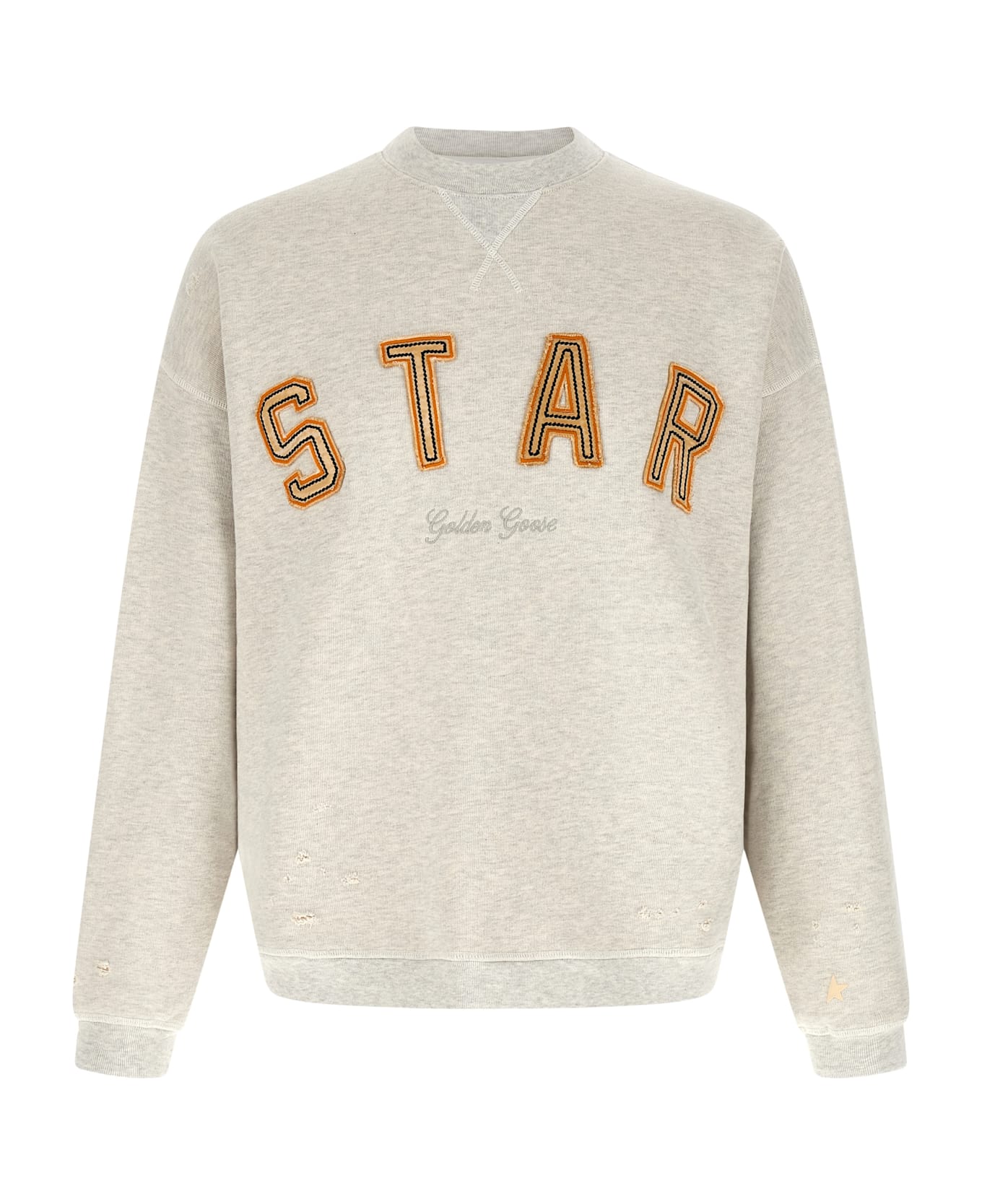 Gauze mélange used-effect cotton sweatshirt, patch and front logo embroidery, crew neck, long sleeves with cuffs and dropped shoulders, band on the hem. Composition: 100% cotton
