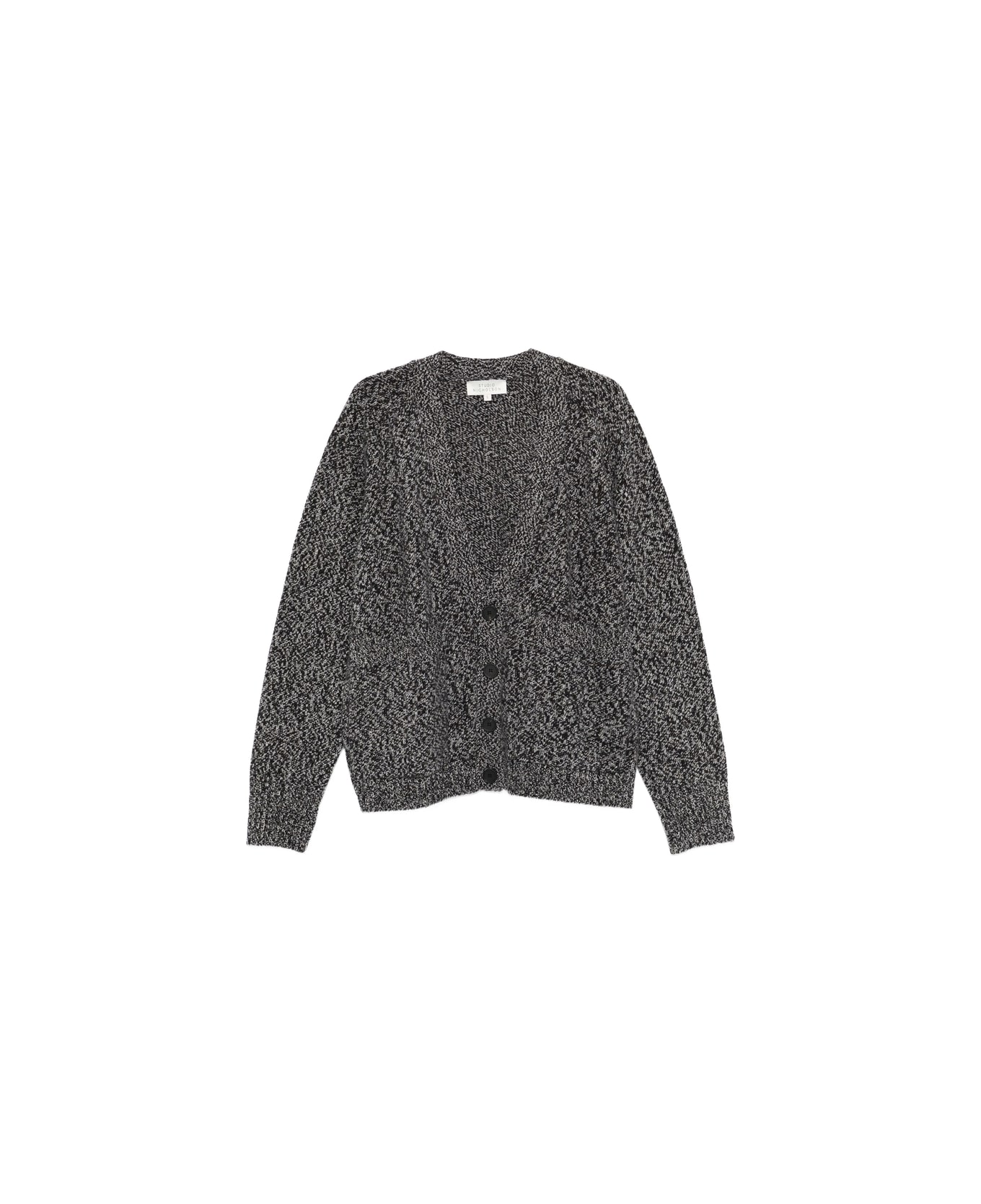 grey wool front button fastening v-neck long sleeves ribbed cuffs and hem