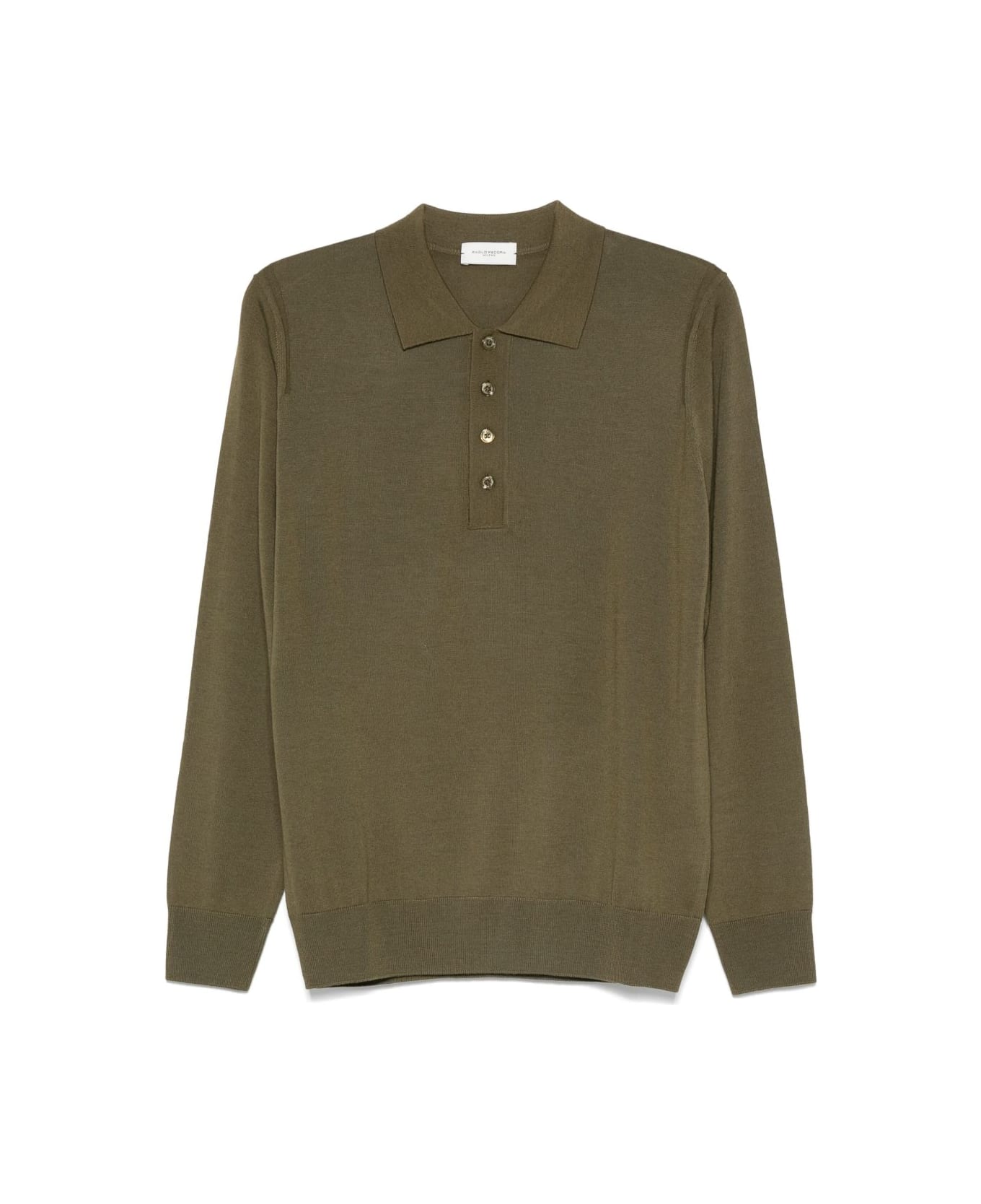 Paolo Pecora Green long-sleeved sweater, polo collar, button placket, ribbed cuffs, ribbed hem, straight hem