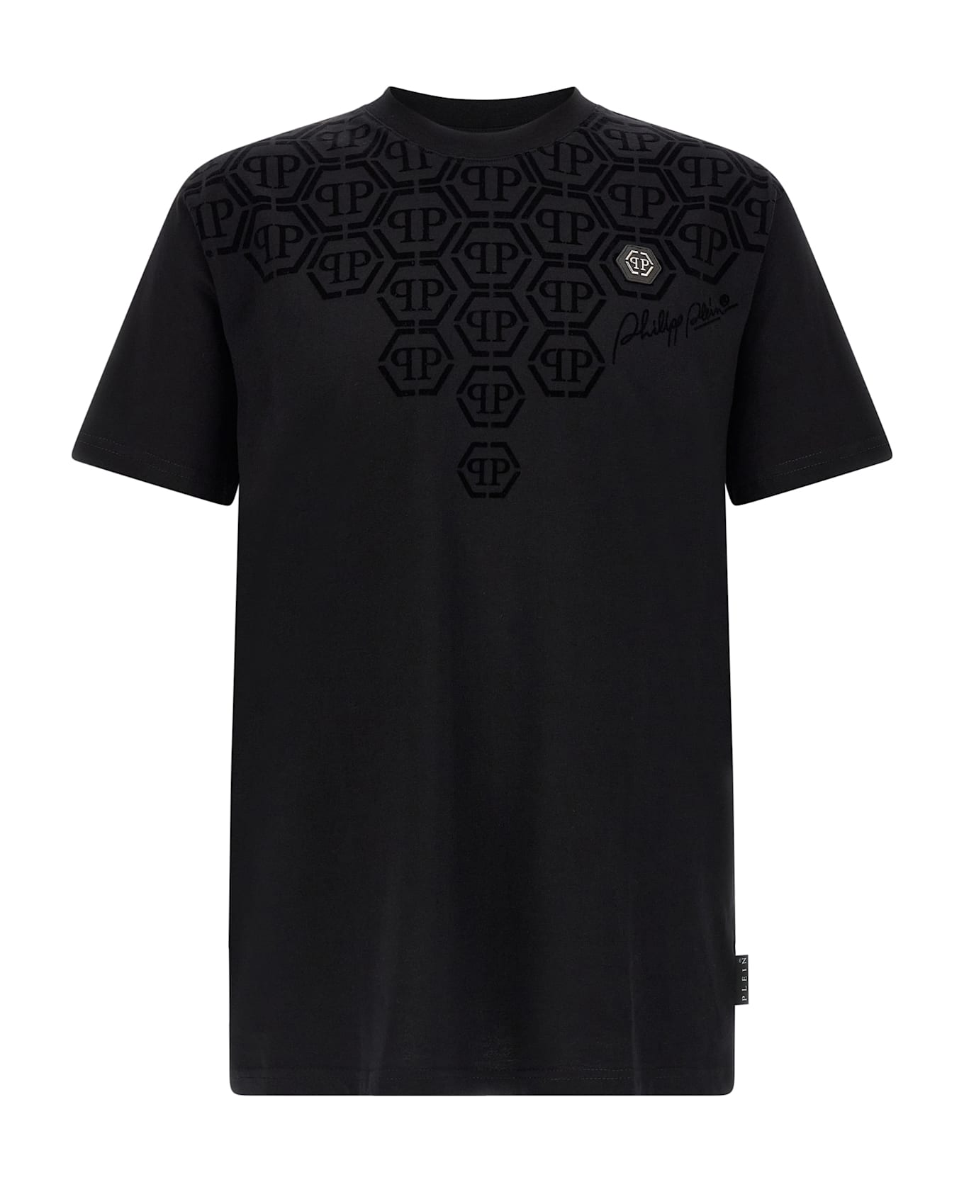 Cotton t-shirt with tone-on-tone flocked monogram logo and front 'Hexagon' patch, crew neck, and short sleeves.