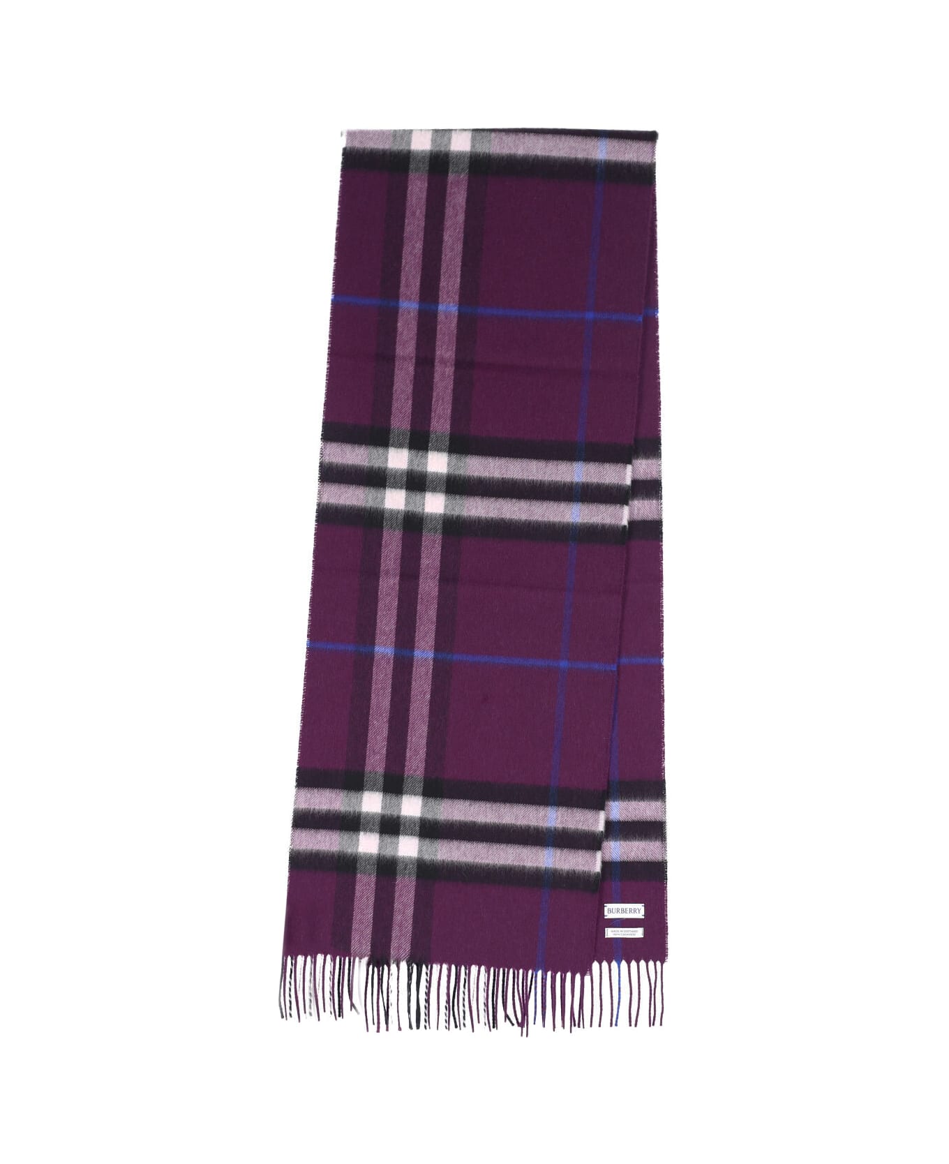 Burberry Check scarf in purple brushed cashmere with iconic all-over logo intarsia pattern, white logo label on the back, rectangular fringes on the bottom. Composition: 100% Cashmere