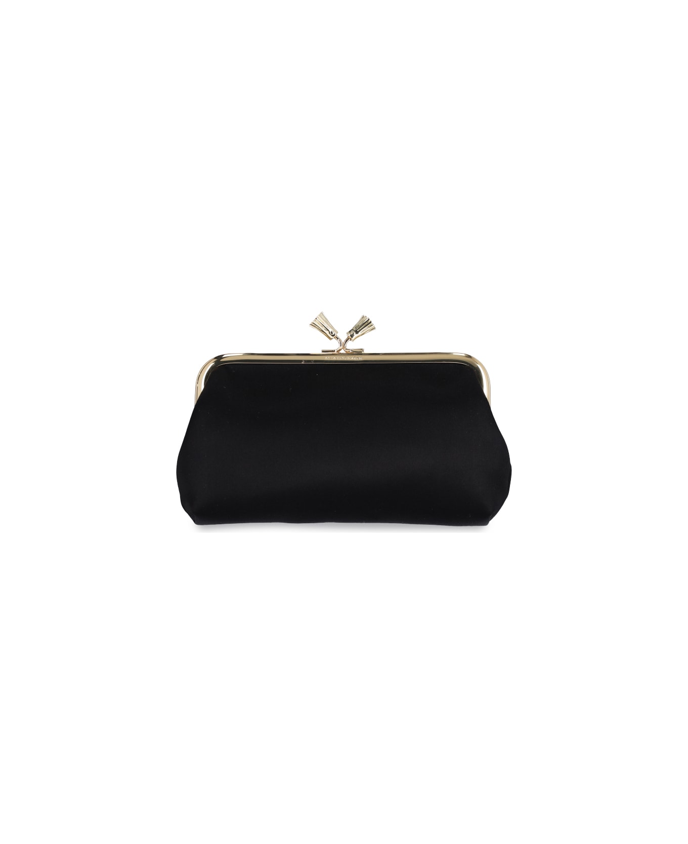 Anya Hindmarch 'Bespoke maud tassel' pouch in black recycled satin with gold metal hook closure, removable gold metal chain shoulder strap, embossed logo lettering at the front, main inner compartment.
