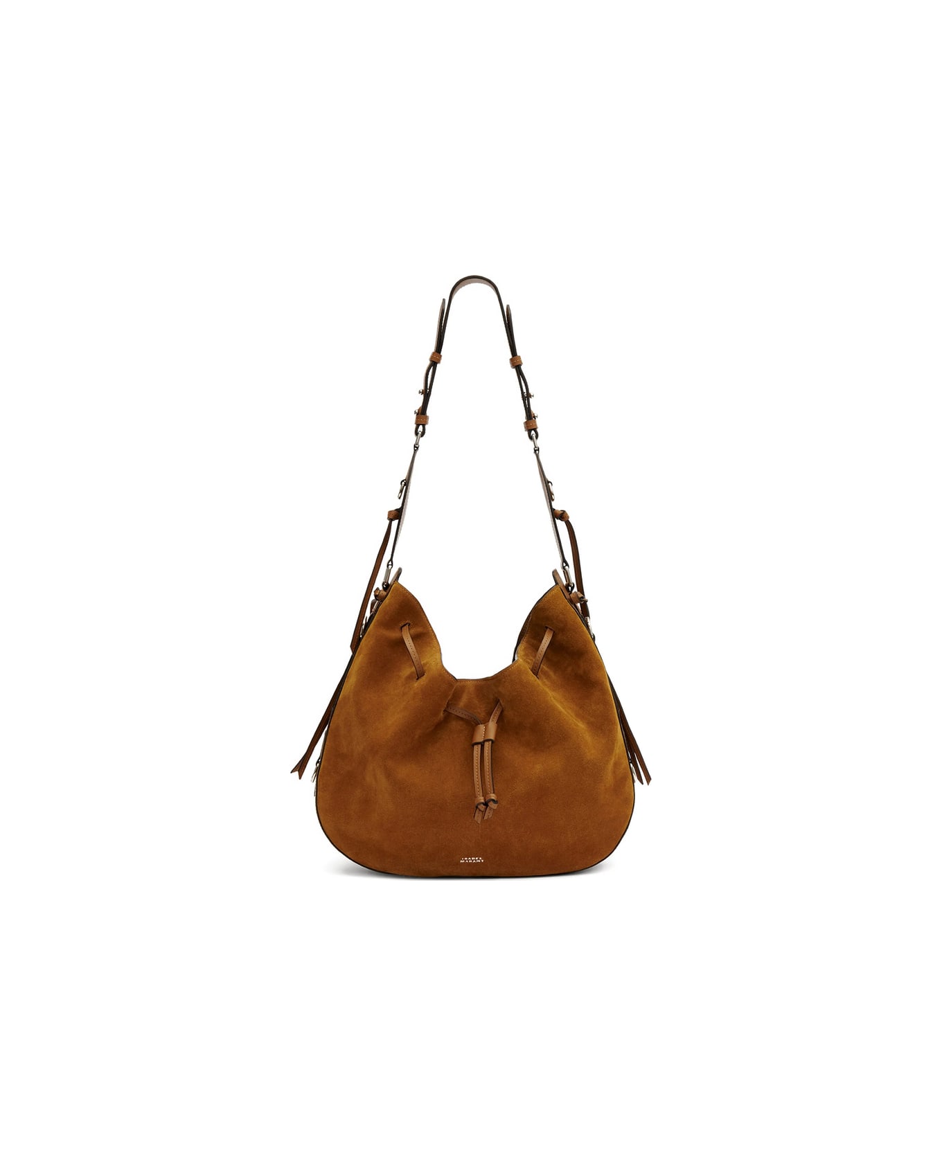 brown calf suede adjustable shoulder strap drawstring fastening includes a pouch