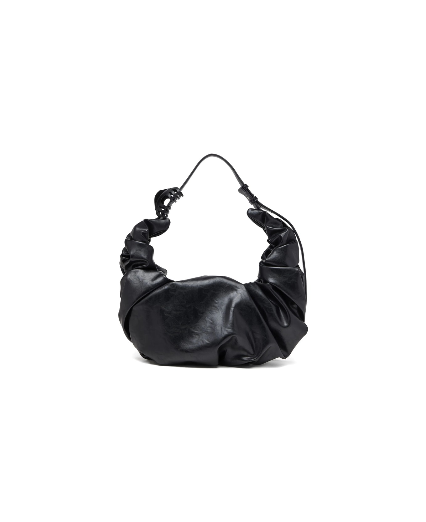 black scrunched design zip fastening single top handle adjustable strap metallic buckle