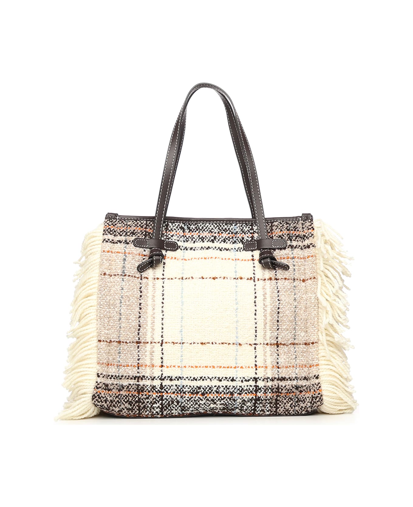 - Made of plaid-effect fabric, wool fringe, and leather inserts - Magnetic closure - Top handles - Made in Italy - Dimensions: 38 x 31 x 16 cm - Designer color: Dark Brown