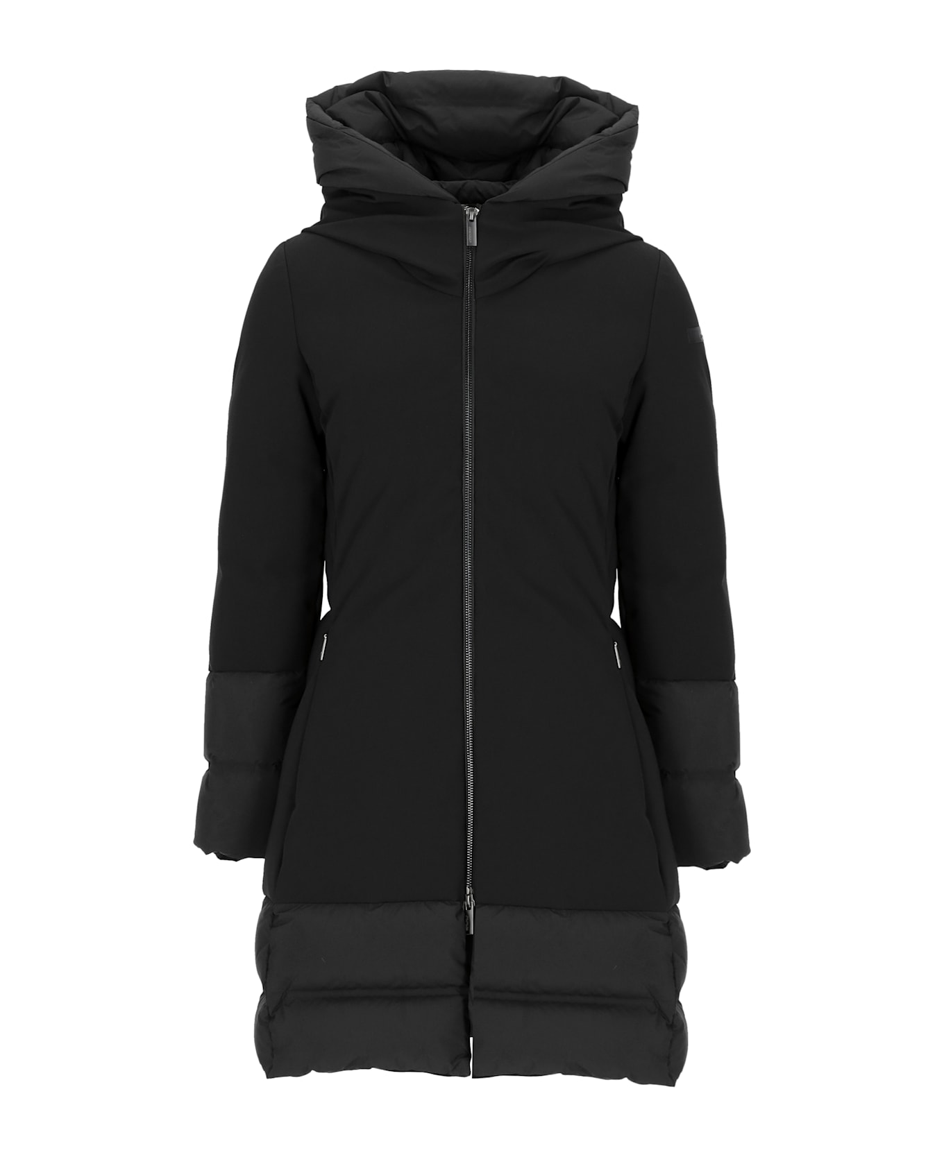 - RRD Roberto Ricci Design woman's black padded coat - Hood - Long sleeves with logoed patch at left sleeve - Front zip fastening - Two side zip pockets
