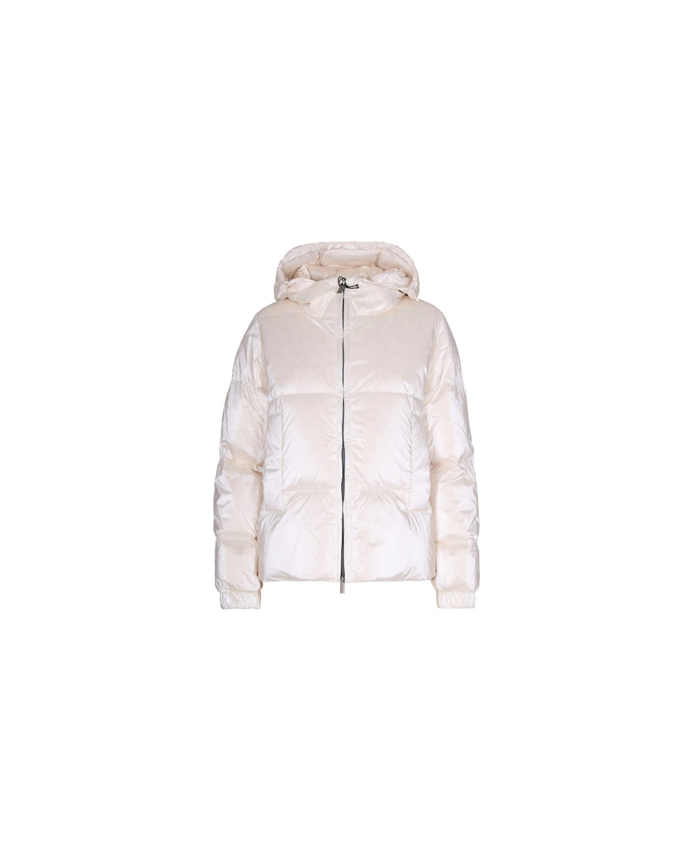 White Lethille down jacket by K-Way, featuring a luminous pearl-effect quilted fabric, Molina down padding, a wraparound hood, a full zip closure with concealed trim, elasticated cuffs, two pockets with snaps, adjustable drawstring hem, and a K-Way tape insert at the cuffs. Regular fit Composition: Lining: 40% Polyamide, 60% Polyurethane Lining: 100% Polyester Filling: 90% Duck Down, 10% Duck Feather Made in Non-EU Countries