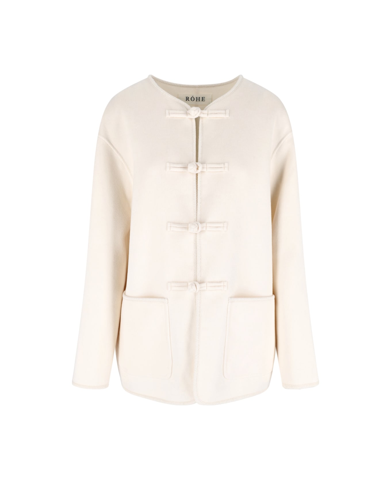 Róhe 'Marie' white wool jacket with crew neck, front toggle closure, long sleeves, two front pockets, curved hem.