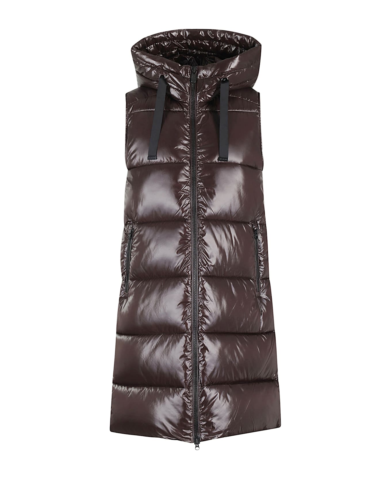 Iria vest - Save the duck - Brown color - Adjustable hood - Padded and quilted fabric - Black logo applique on bottom - Maxi length - Central zipper closure - Flush side pockets with zipper