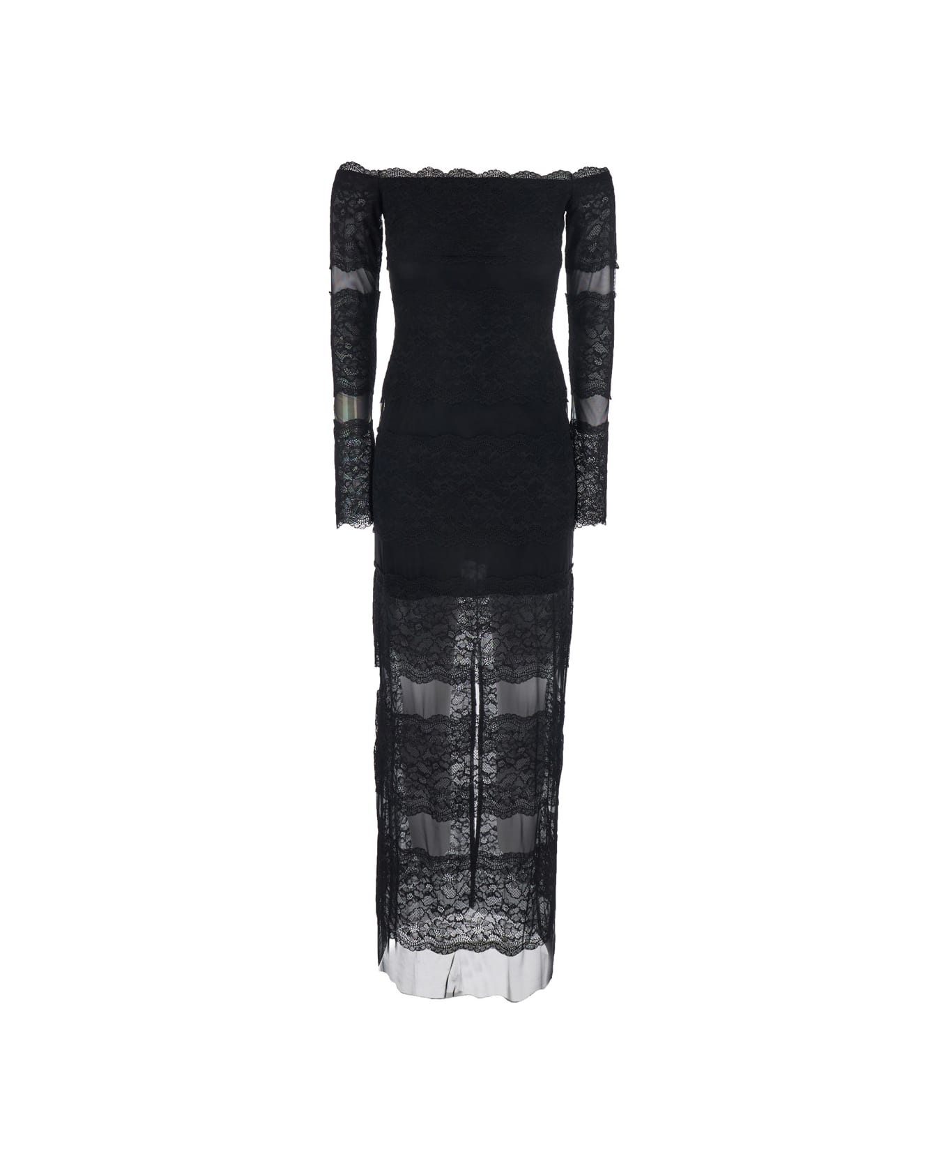 Long dress Black Off-the-shoulder Long sleeves Lace details All-over embroidery Semi-sheer design Technical fabric Regular fit
