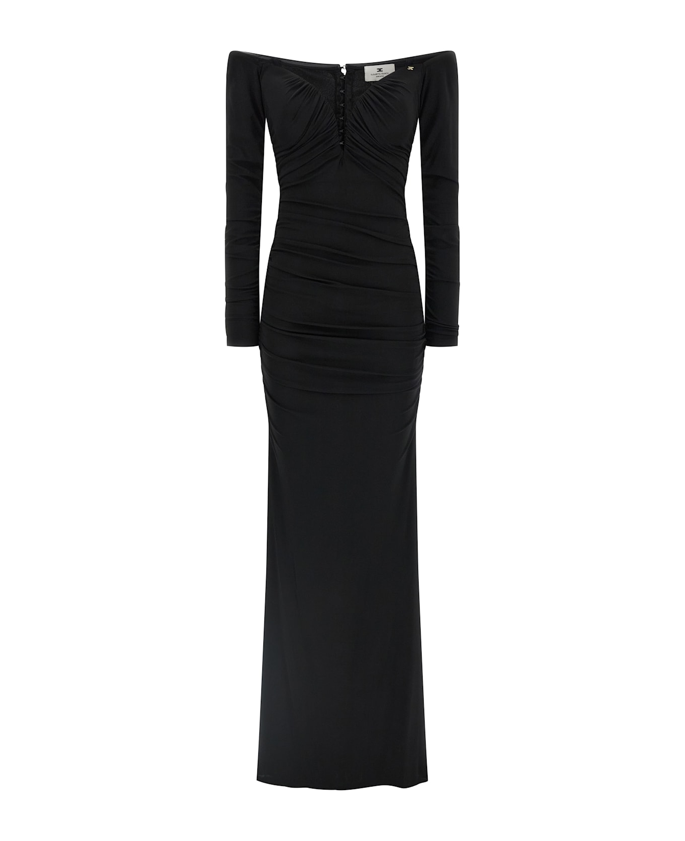 Long 'Red Carpet' dress in crêpe jersey with front and back draping, off-the-shoulder style with deep sweetheart neckline, long sleeves, mermaid skirt with light train, back zip closure. Composition: 95% viscose, 5% elastane