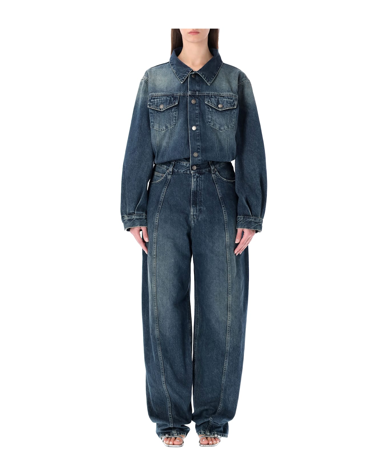 The Amber Denim Jumpsuit By Haikure Elevates A Workwear Classic Through A Dark-wash, Worn-in Denim And A Relaxed, Wide-leg Silhouette. Structured Yokes, Flap Chest Pockets, And Metallic Button Closures Define The Design, While The Subtly Shaped Waist Enhances The Figure With Effortless Ease. A Bold, Contemporary One-piece With Understated Sophistication. Dark-wash Lived-in Denim Relaxed Wide-leg Silhouette Front Metallic Button Closure Flap Chest Pockets Sculpted Seam Detailing Waist Loops Alessandra Is 1,75 M And Wears Size S