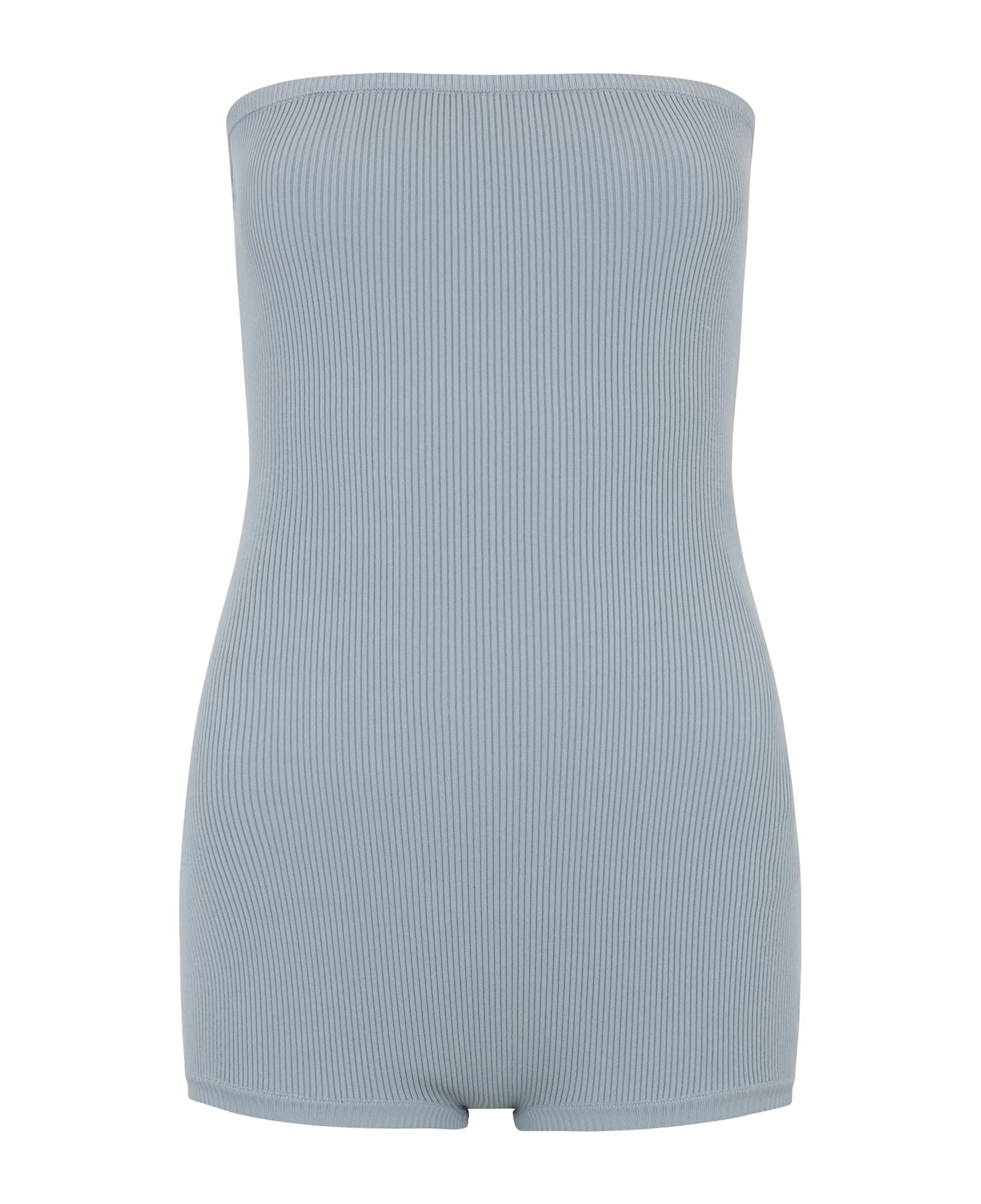 This product is a short jumpsuit without straps in an elegant blue color. it features a fitted silhouette that accentuates the figure, offering a comfortable and versatile fit for various occasions. ideal for being worn under fitted clothing or as part of a chic outfit. made with soft and elastic fabrics, it ensures freedom of movement. perfect for those seeking practicality and style.