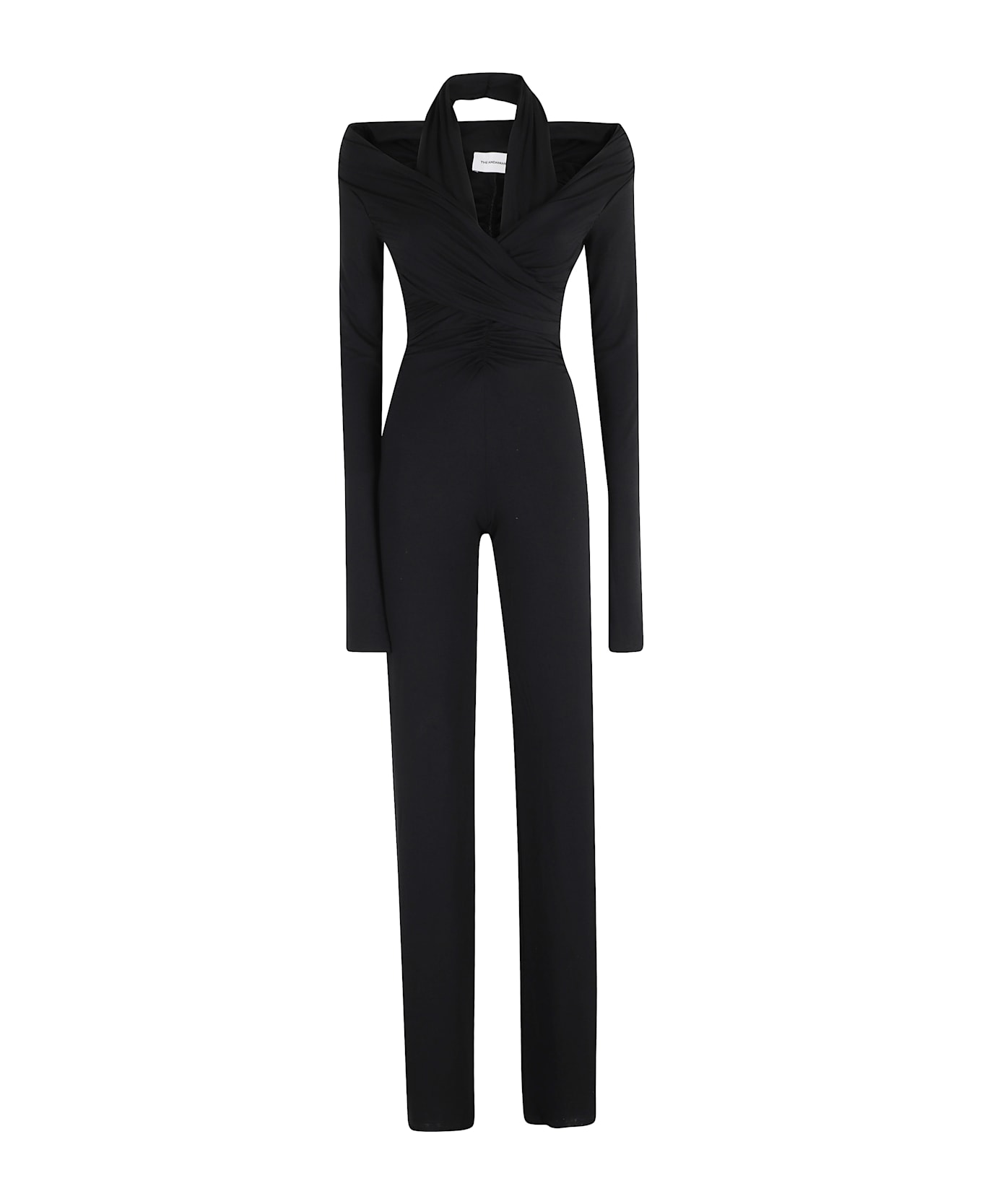 Yvonne jumpsuit - The Andamane - black color - suede-effect jersey - plunging neckline with neck strap - bare shoulders - long sleeves - flared pants - fitted fit