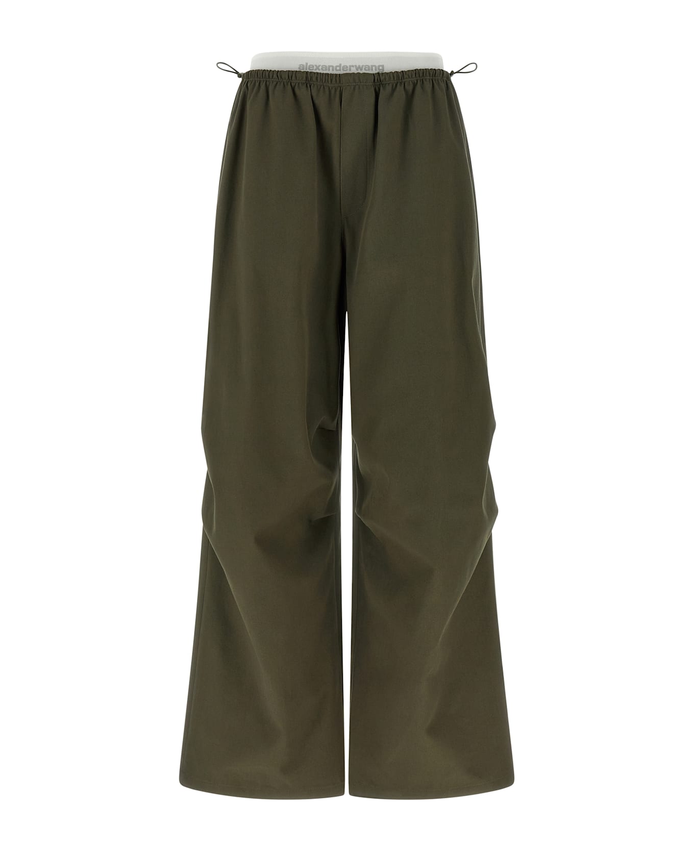 Cotton trousers, double layer waist with contrast logo elastic band insert, medium waist, trompe l'oeil flap, pockets, drawstring at the waist, pinch on the knees, extra wide leg.