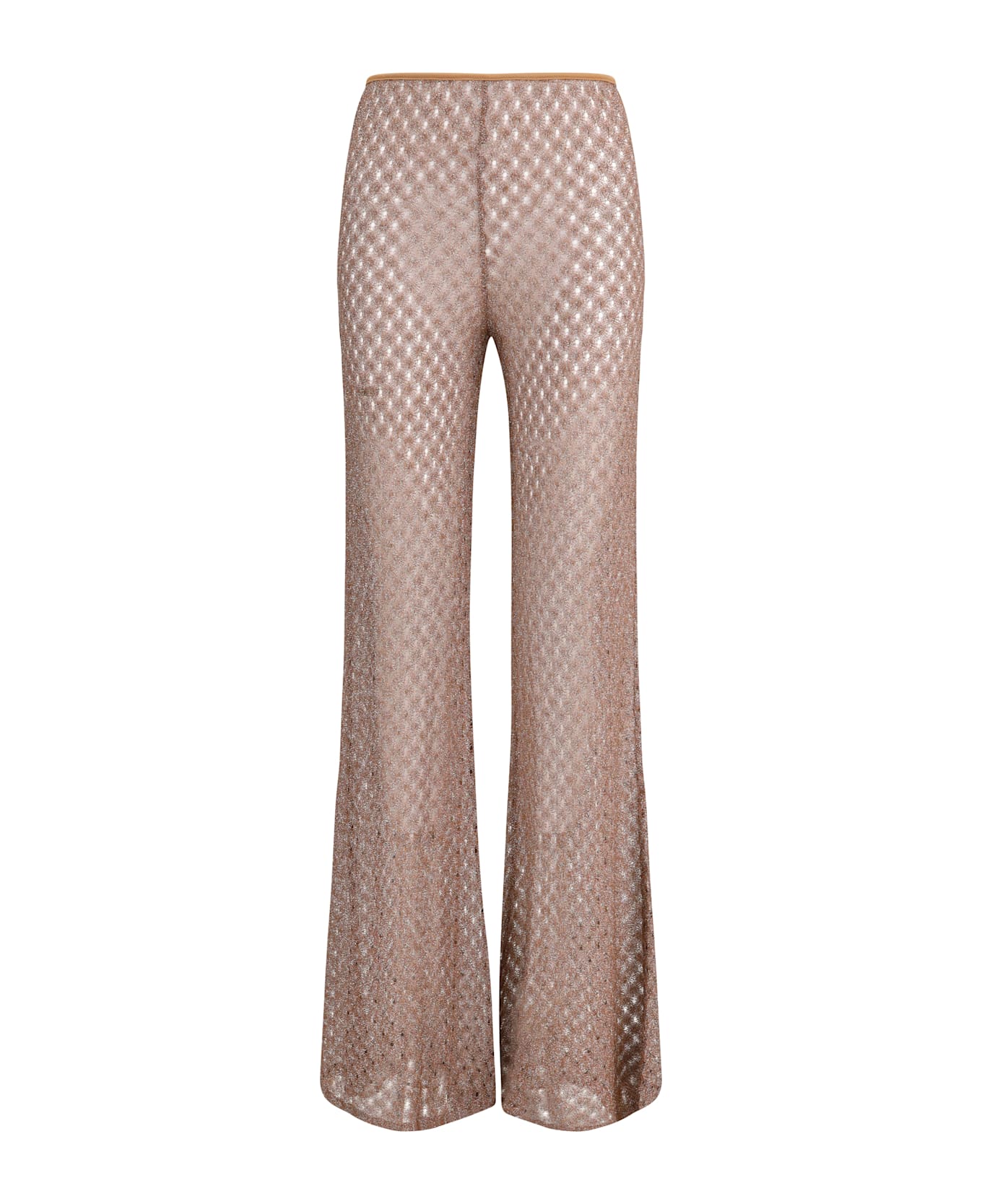 The flared knit trousers with lamé by missoni embody the brand s signature blend of lightness and modern glamour. crafted in openwork knit with shimmering lamé threads, they feature a flared silhouette that moves with effortless fluidity. a luminous and refined piece, perfect for elevating beach looks and more.