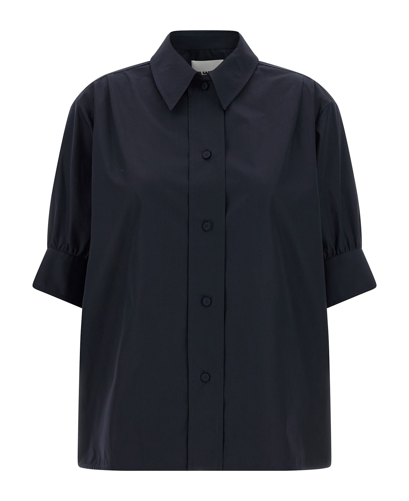 Heavy cotton poplin shirt, pointed collar, front button closure, wide round short sleeves with curls and cuffs. SUSTAINABLE: This product is made with organic cotton. Composition: 100% cotton