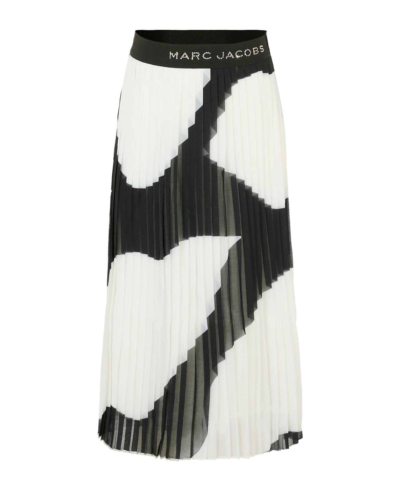 Black and white pleated skirt, with an elasticated wais. It is embellished with rhinestone logo on the front.