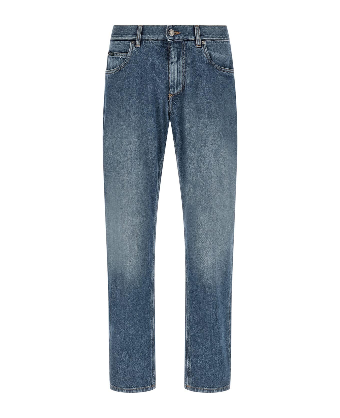Stone-washed cotton denim jeans with contrast stitching, straight leg, regular waist, front zip and button closure, five pockets, back heraldic embroidery.