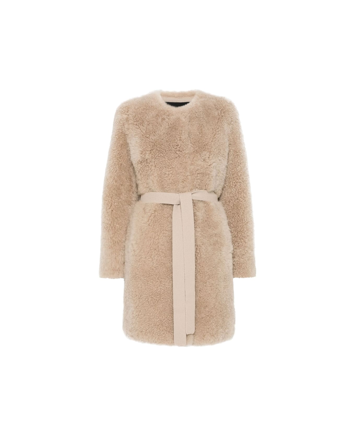sesame beige shearling front hook and eye fastening round neck long sleeves two side inset pockets silk lining straight hem