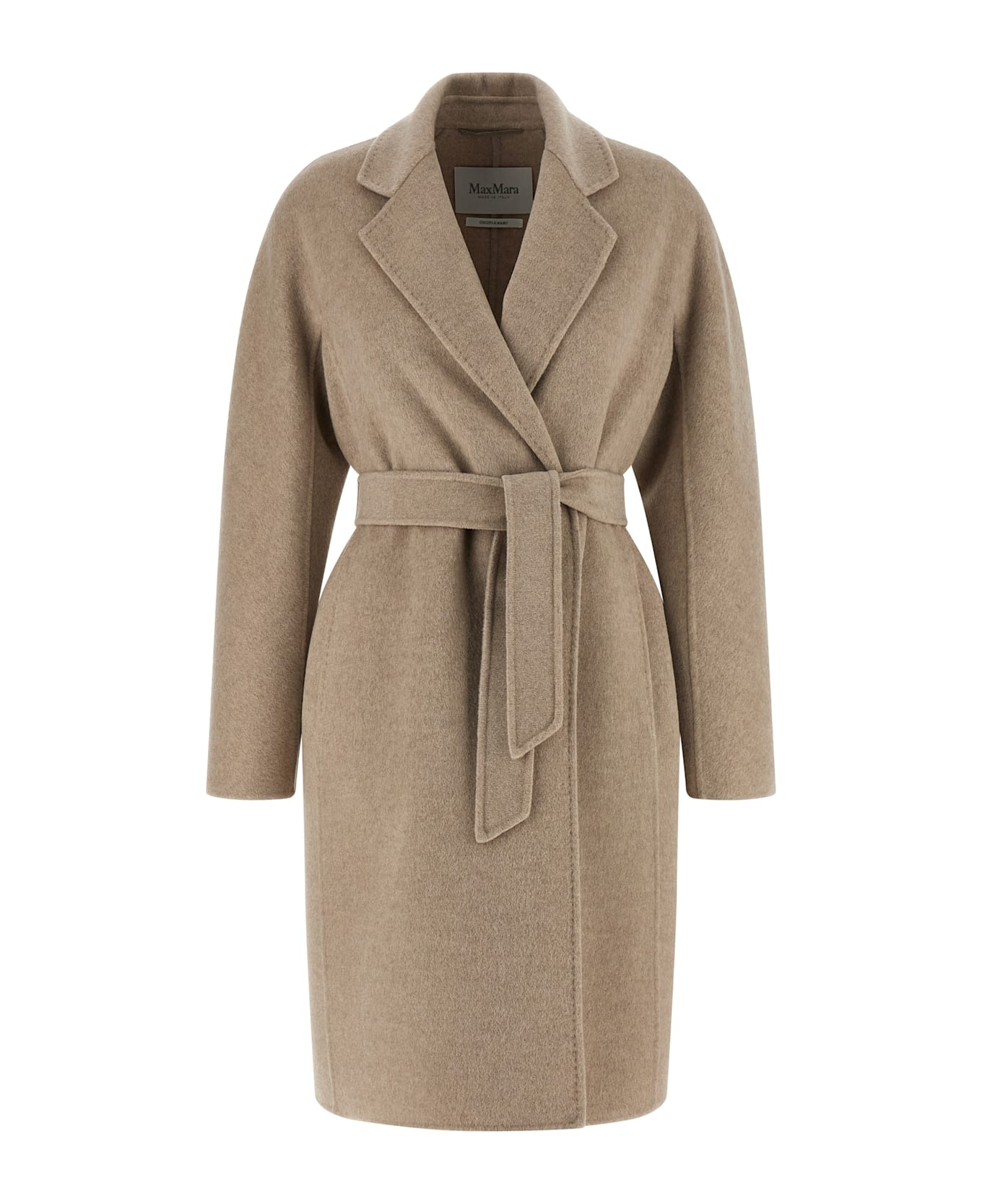 'MxMaceri' midi coat in double drap of hand-stitched pure cashmere finished with tailored dot, robe style, lapel collar, raglan-cut kimono sleeves on the back, pockets, unlined, removable belt. Composition: 100% cashmere