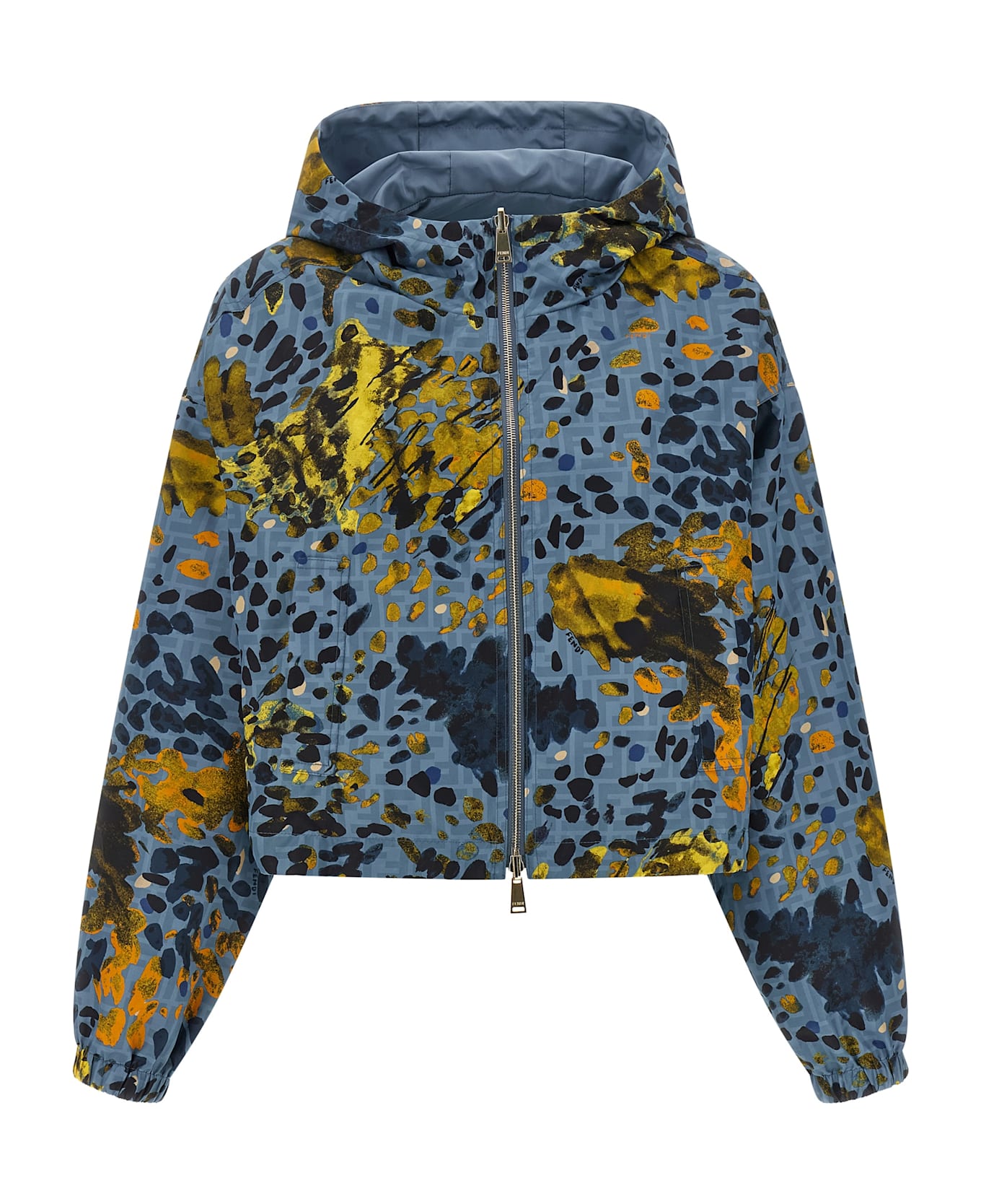FF reversible nylon windbreaker with all-over and solid color 'Falena' print with tone-on-tone leather 'Fendi Roma' patch, adjustable hood, crop model, flared silhouette, front zip closure, pockets, long sleeves with elastic cuffs and dropped shoulder, drawstring on the hem.