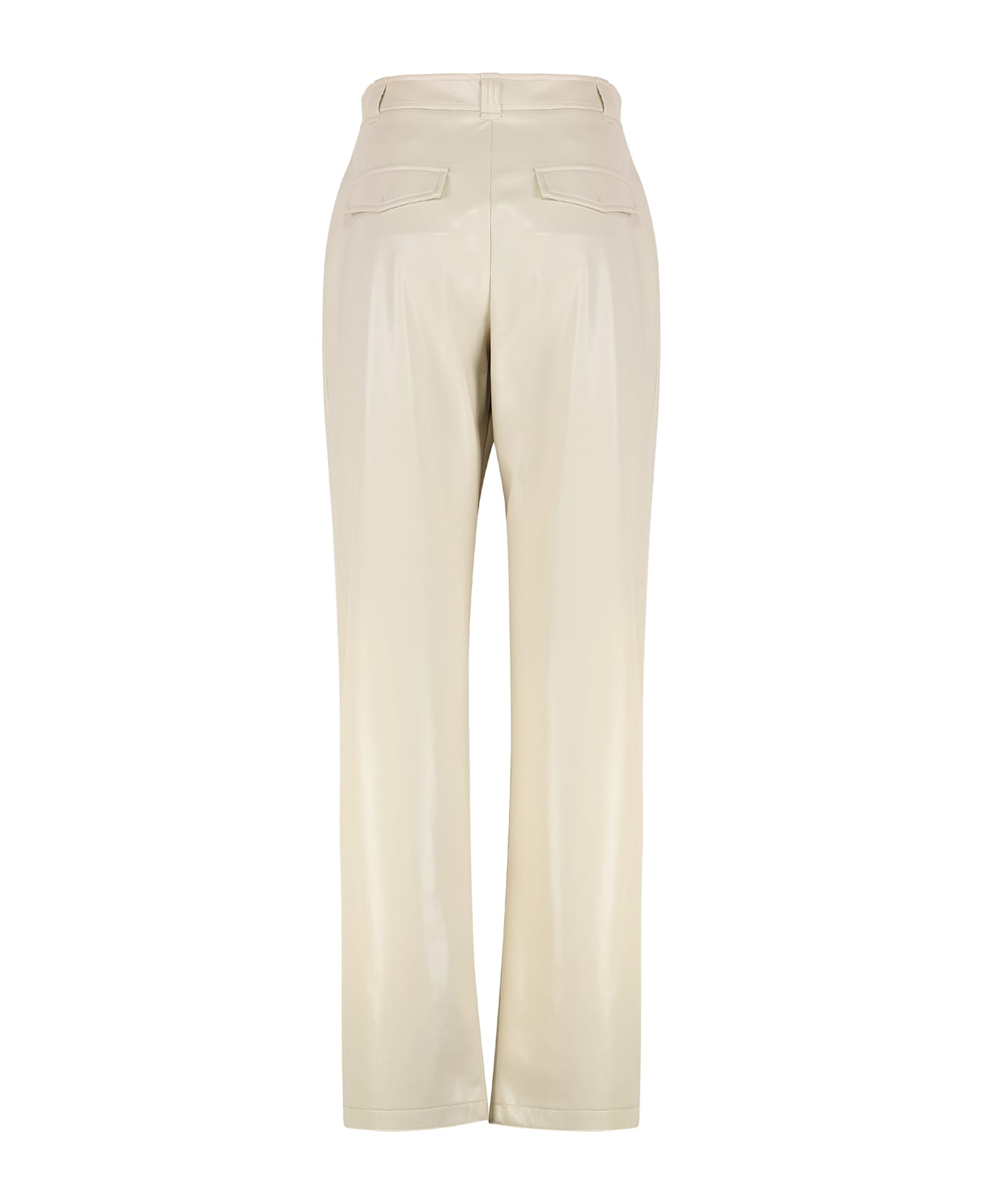 Balloon-fit pants with a soft, rounded balloon leg at the top and narrower at the bottom. the model, made of soft touch faux leather laminate fabric, features belt loops, two side pockets, and faux pockets with flaps on the back. closure with button and hidden zipper. the clean and simple line of this garment makes it a must-have addition to your wardrobe.