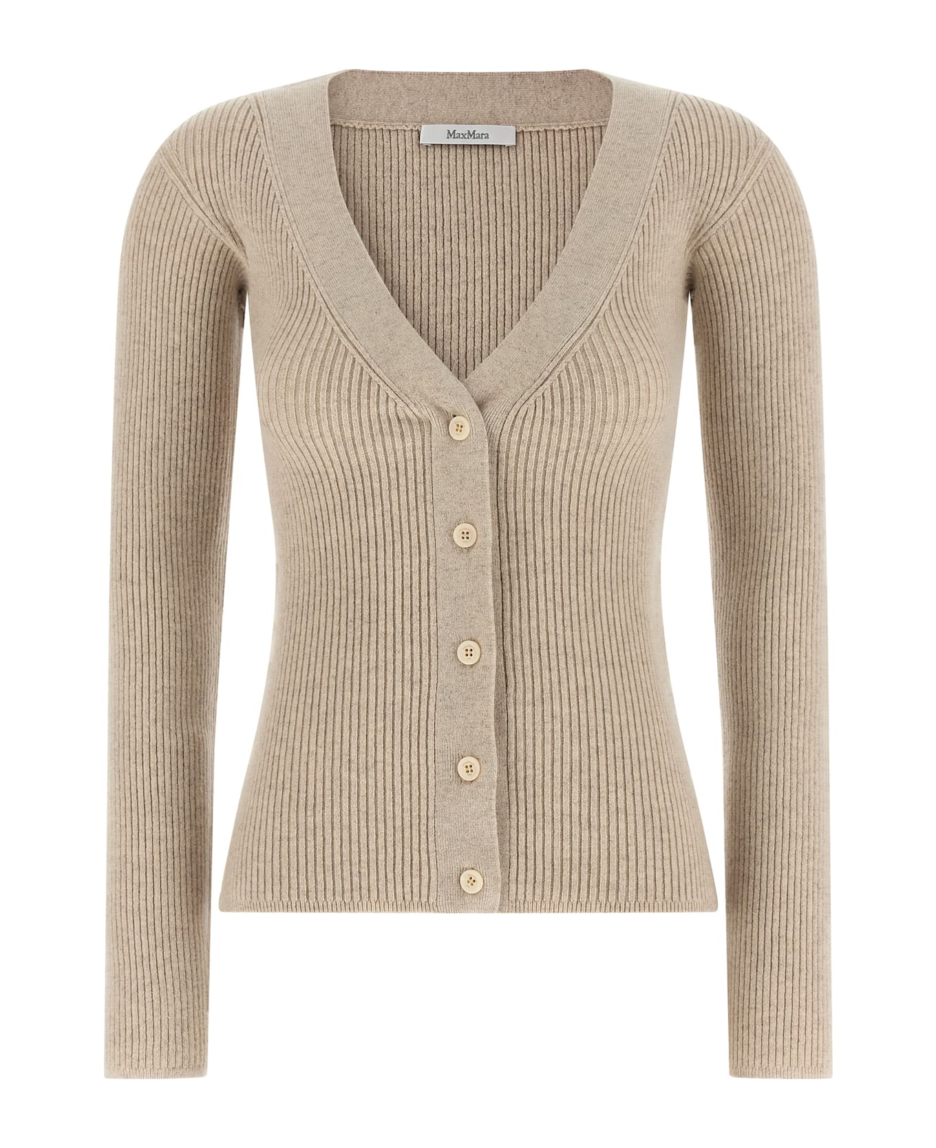 'Mxmgioiosa' ribbed wool and cashmere yarn sweater, wide V-neck, trompe l'oeil button closure on the front, long sleeves with dropped shoulders. Composition: 62% wo, 27% ws, 10% pa, 1% ea