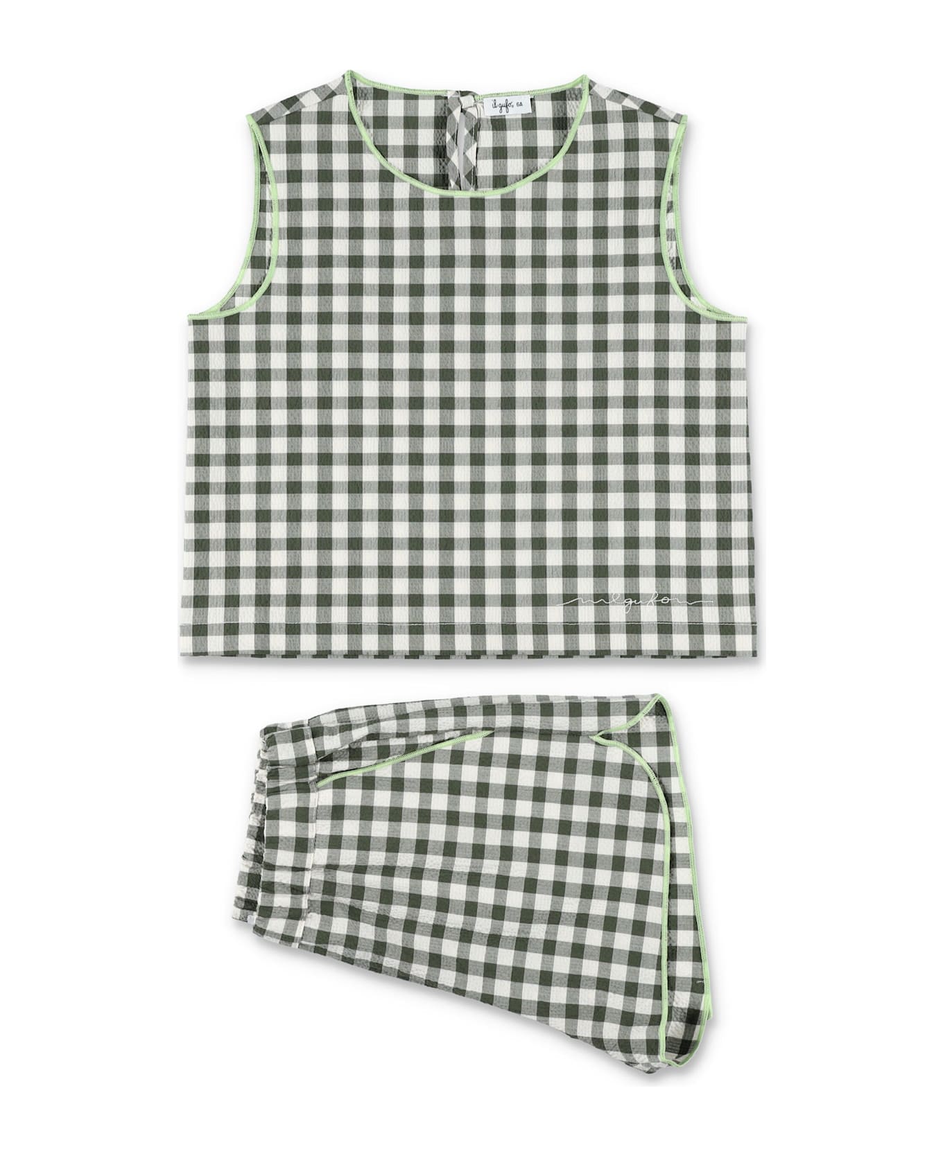 Cotton Gingham Check Seersucker Set By Il Gufo. Featuring: Sleeveless Top With Embroidered Logo At Hem, Straight Cut And Contrast Edges Shorts With Elastic Waistband, Slant Pockets, Side Slits And Contrast Edges