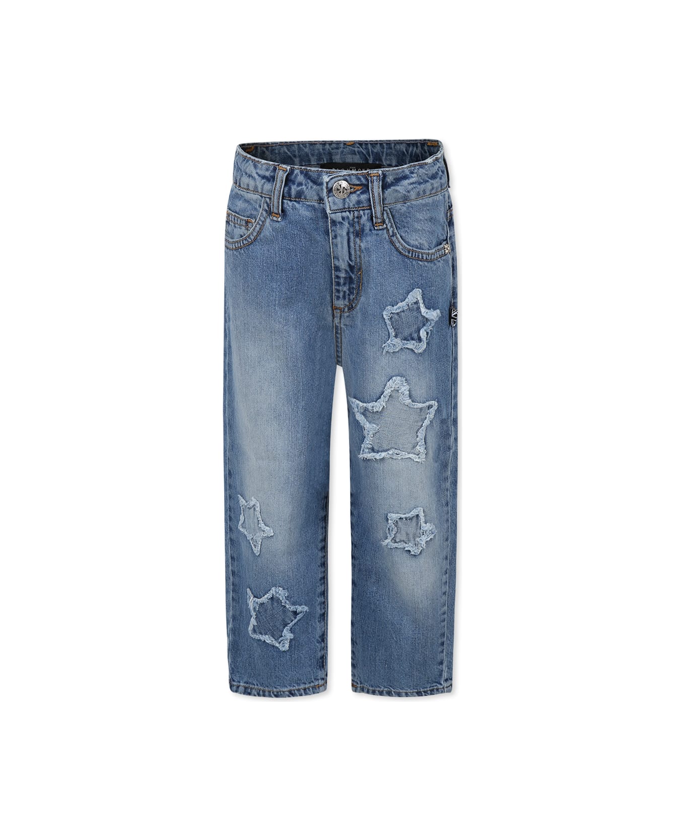 Five-pocket denim jeans, in cotton, with belt loops, front zip and button fastening, adjustable waist thanks to internal elastic with buttons. They are embellished with stars and fringes on the front and a logo patch on the back.