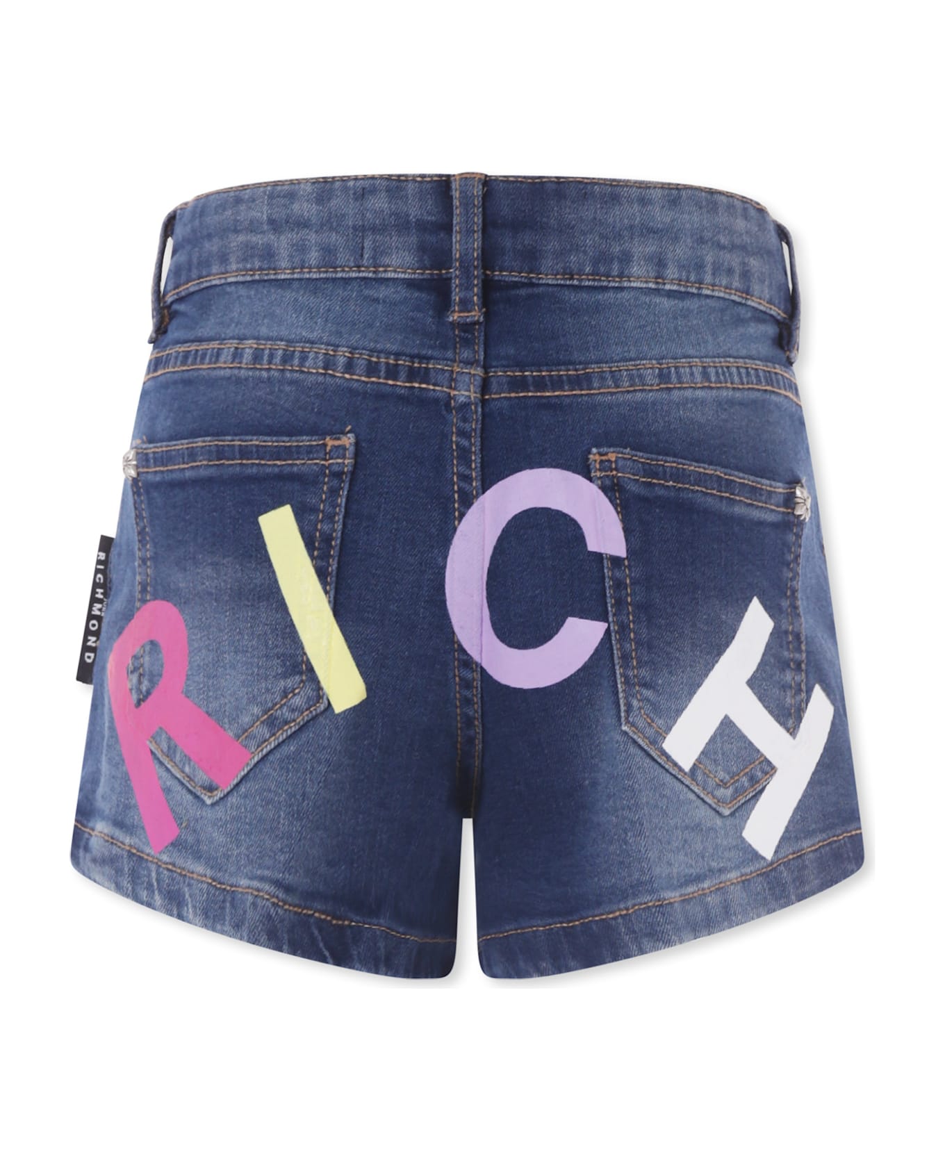 Five-pocket denim shorts, with belt loops, front zip and button fastening and adjustable waist thanks to internal elastic with buttons. They are decorated with a multicolor logo on the back and a side logo patch.