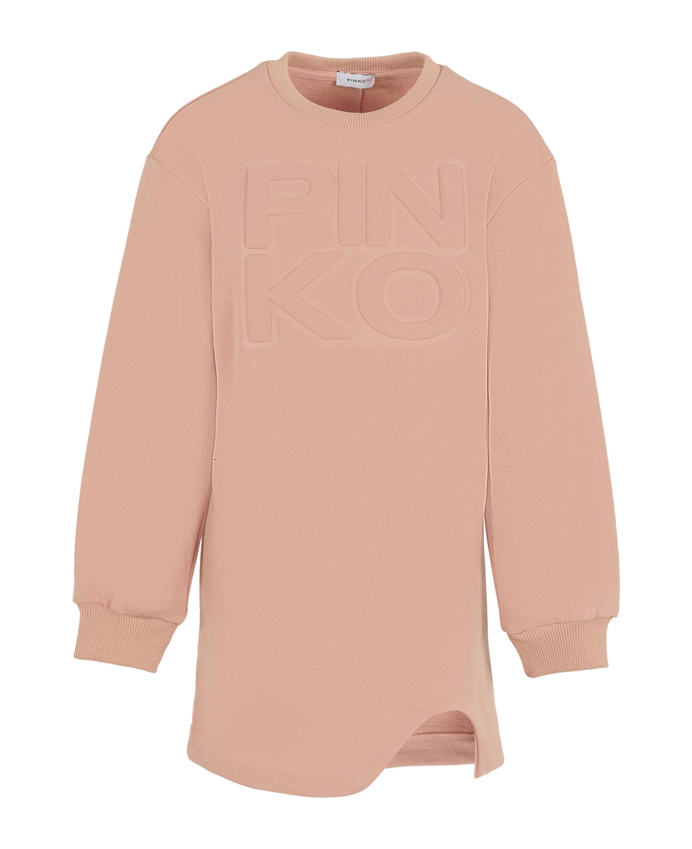 Pink long-sleeved, brushed cotton dress with a crew neck, ribbed cuffs, and asymmetric hem. It is embellished with a padded logo in relief on the front.