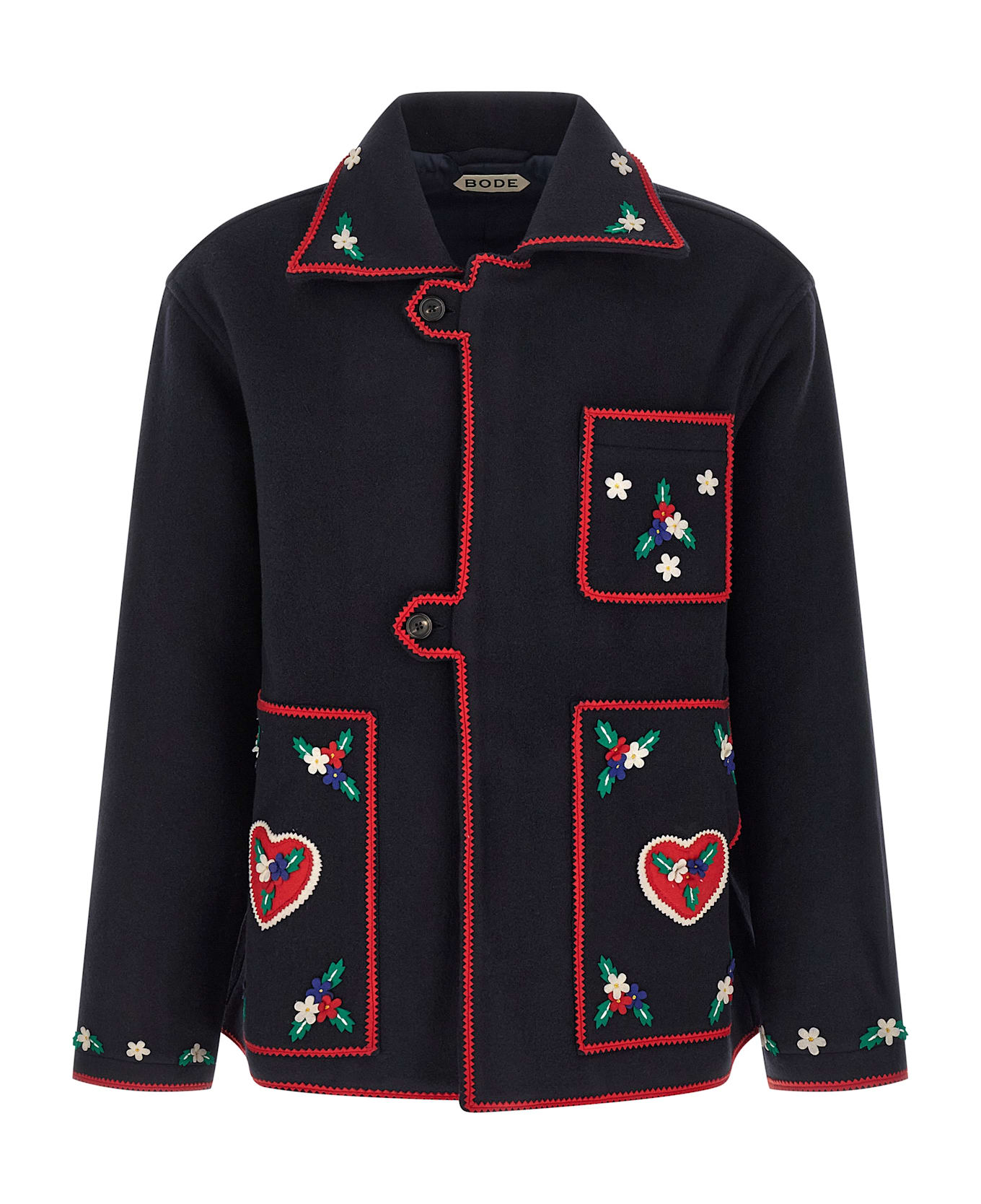 'Carroll' wool jacket, felt patches reminiscent of scenes from the production of the live action Alice of which Moose Charlap composed the soundtrack in 1966, shirt collar, front button closure, pockets, long sleeves, lining.