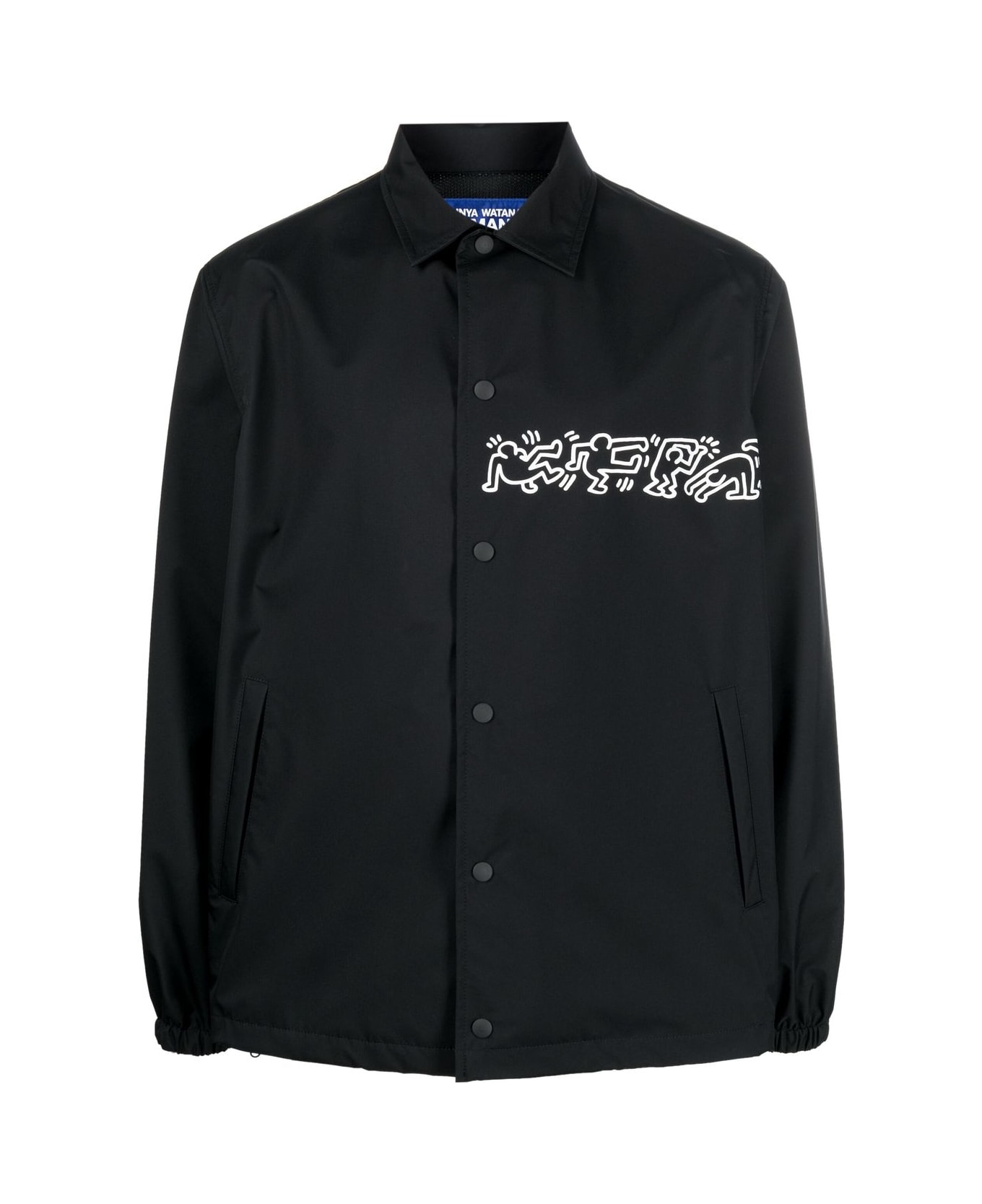 Keith Haring-print shirt jacket from Junya Watanabe featuring black/white, graphic print at the chest, graphic-print sleeves, pointed flat collar, front press-stud fastening, two side welt pockets, long sleeves, elasticated cuffs and straight hem.