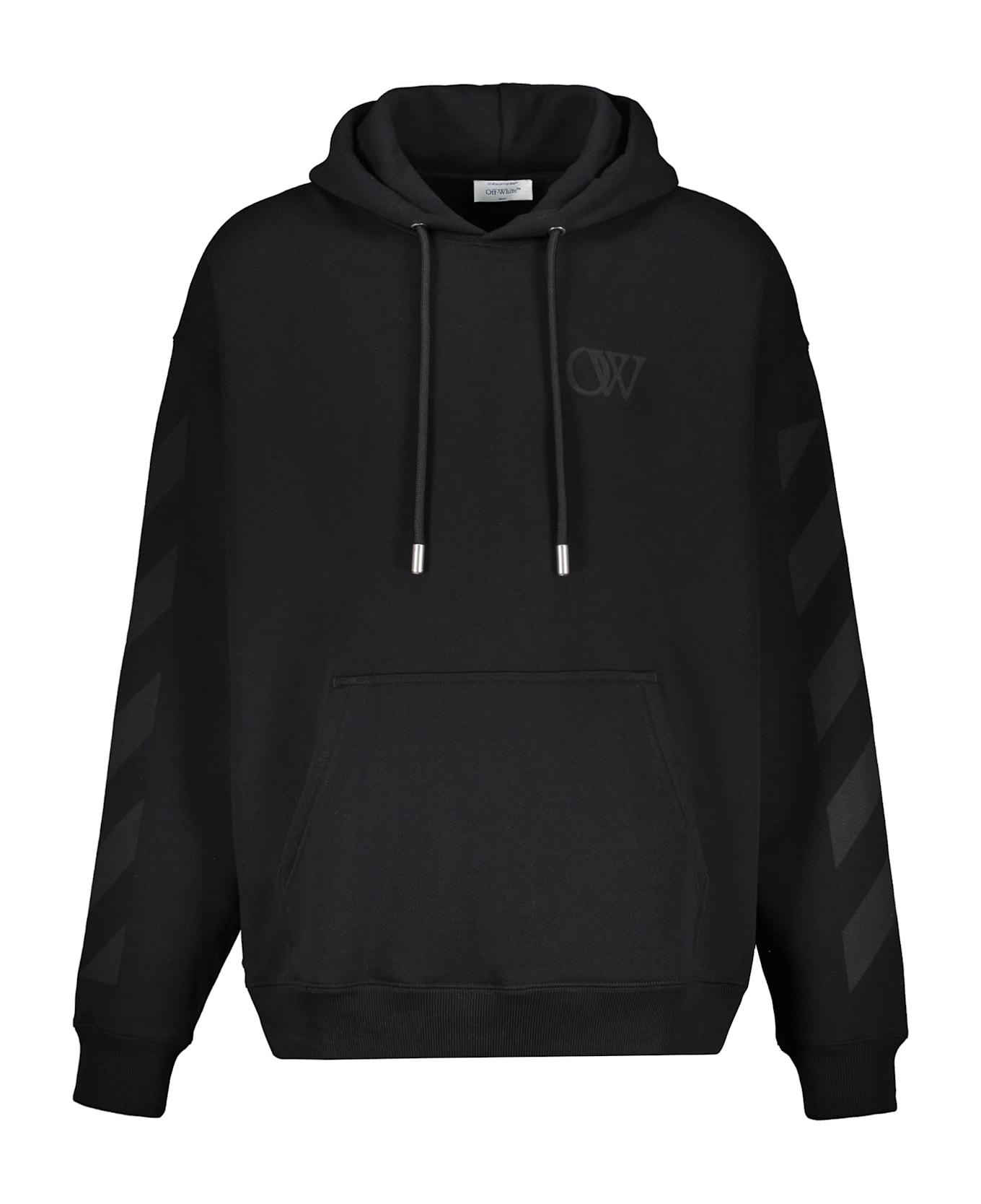 Hooded sweatshirt in black color, made from a soft and comfortable fabric. it features a simple and elegant design, with an adjustable hood using drawstrings and long sleeves. a discreet logo is visible on the chest, while the sleeves are adorned with a stripe pattern. perfect for a casual and versatile look, ideal to wear during the autumn and winter seasons. available in various sizes to ensure an optimal fit.