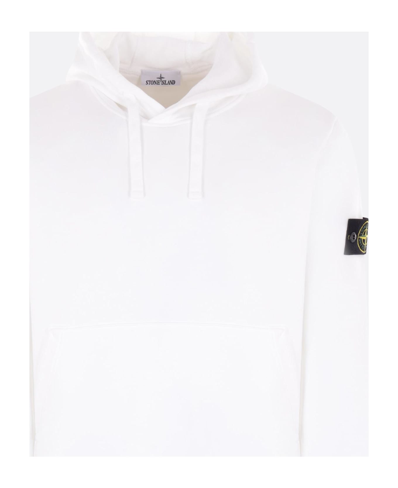 Stone Island hoodie crafted in white cotton jersey. Featuring a kangaroo pocket, long sleeves, ribbed edges, and a straight hem. The design is completed with the signature logo badge on the left sleeve. Composition: 100% cotton