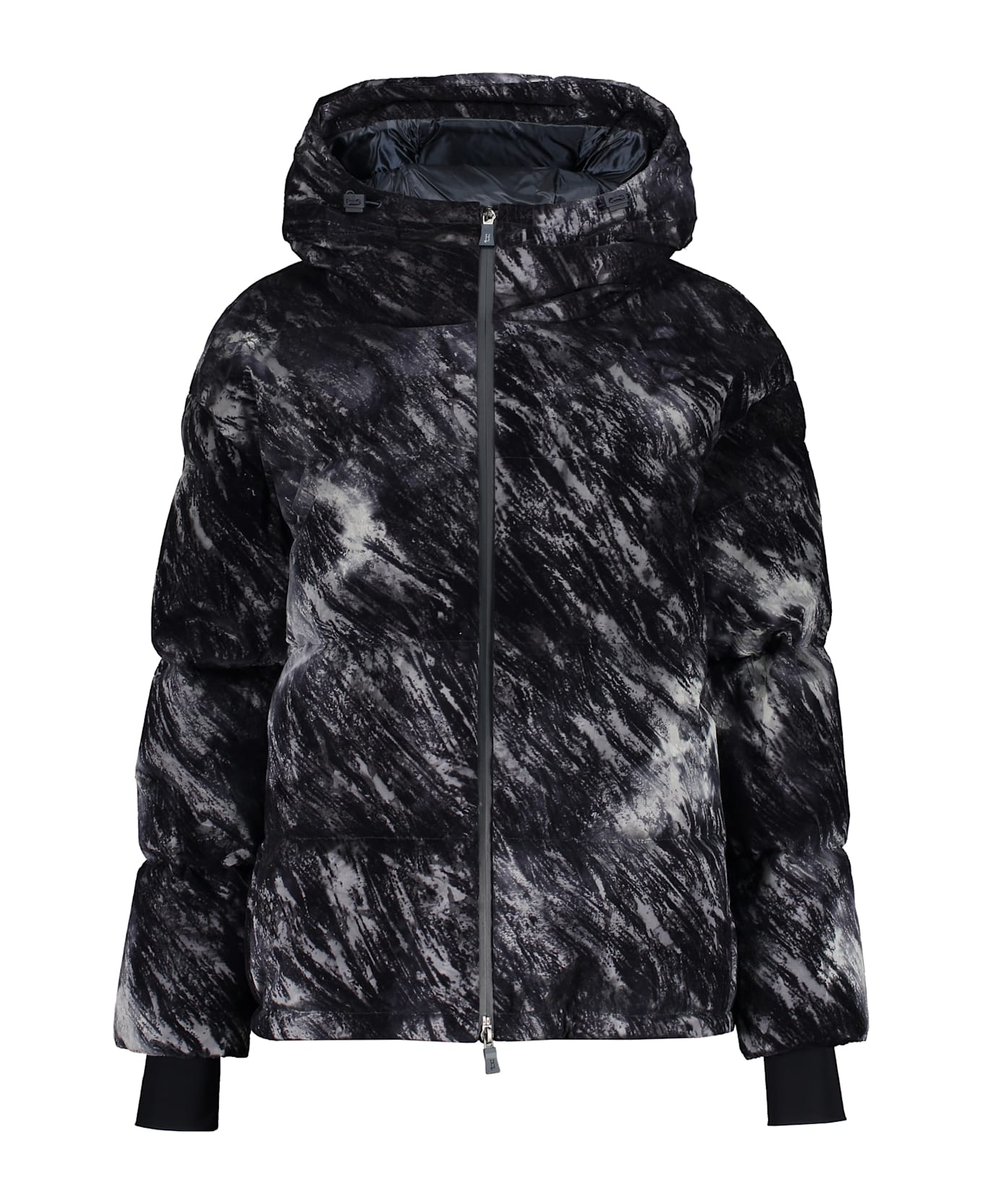 Down jacket with hood, characterized by an elegant and modern design. the combination of dark tones and nuances created by the material gives it a unique appearance. equipped with a front zip closure and practical side pockets, it offers comfort and warmth during the colder days. the loose fit allows freedom of movement, making it ideal for various occasions. perfect to pair with casual or sporty outfits. padding: 80% goose down; 20% goose feather.