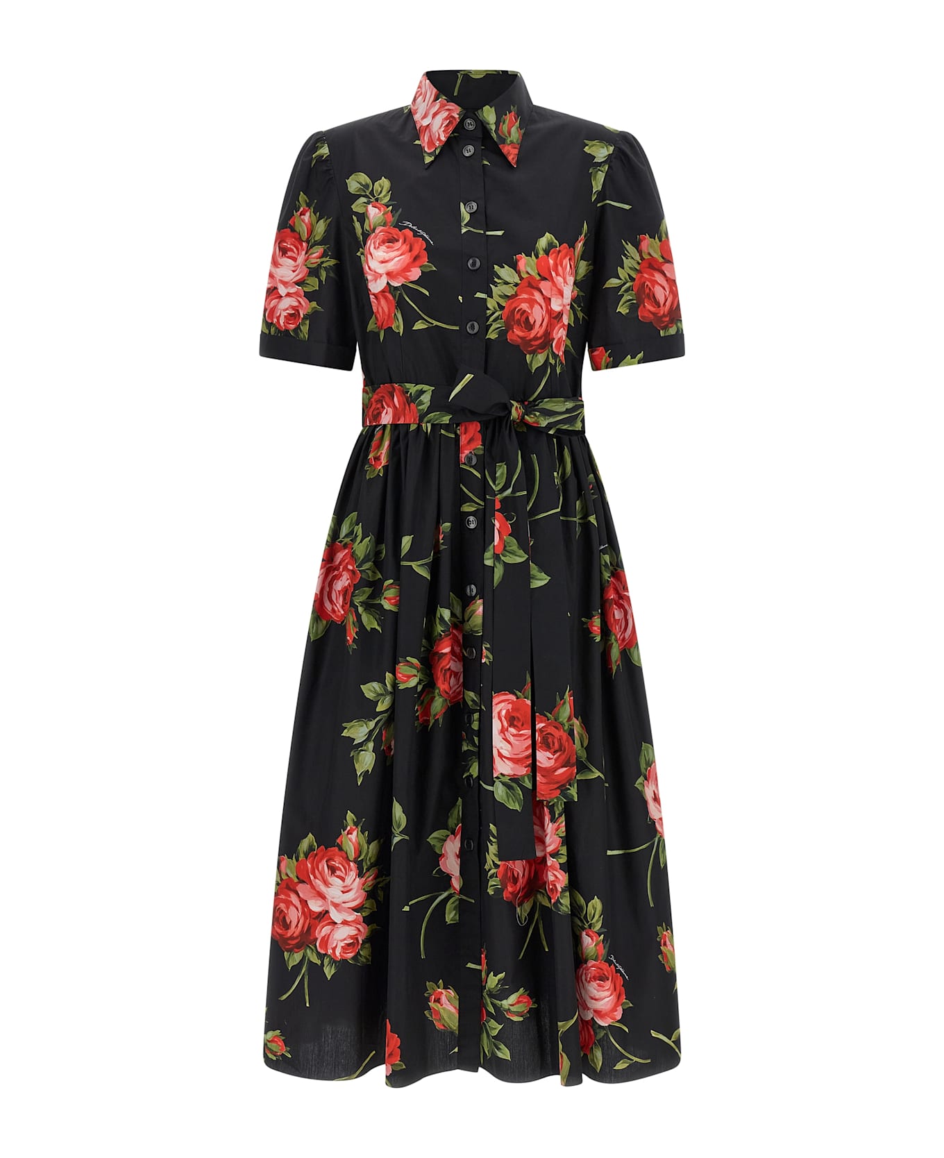 'Bouquet Rose' print poplin midi dress with chemisier style, pointed collar, front button closure, short sleeves, flared silhouette skirt, pleats and curl at the waist, pockets, belt. The differences in print placement you might find on this product is a characteristic of Dolce&Gabbana's Handmade products. A peculiarity that makes each garment or accessory unique and exclusive.