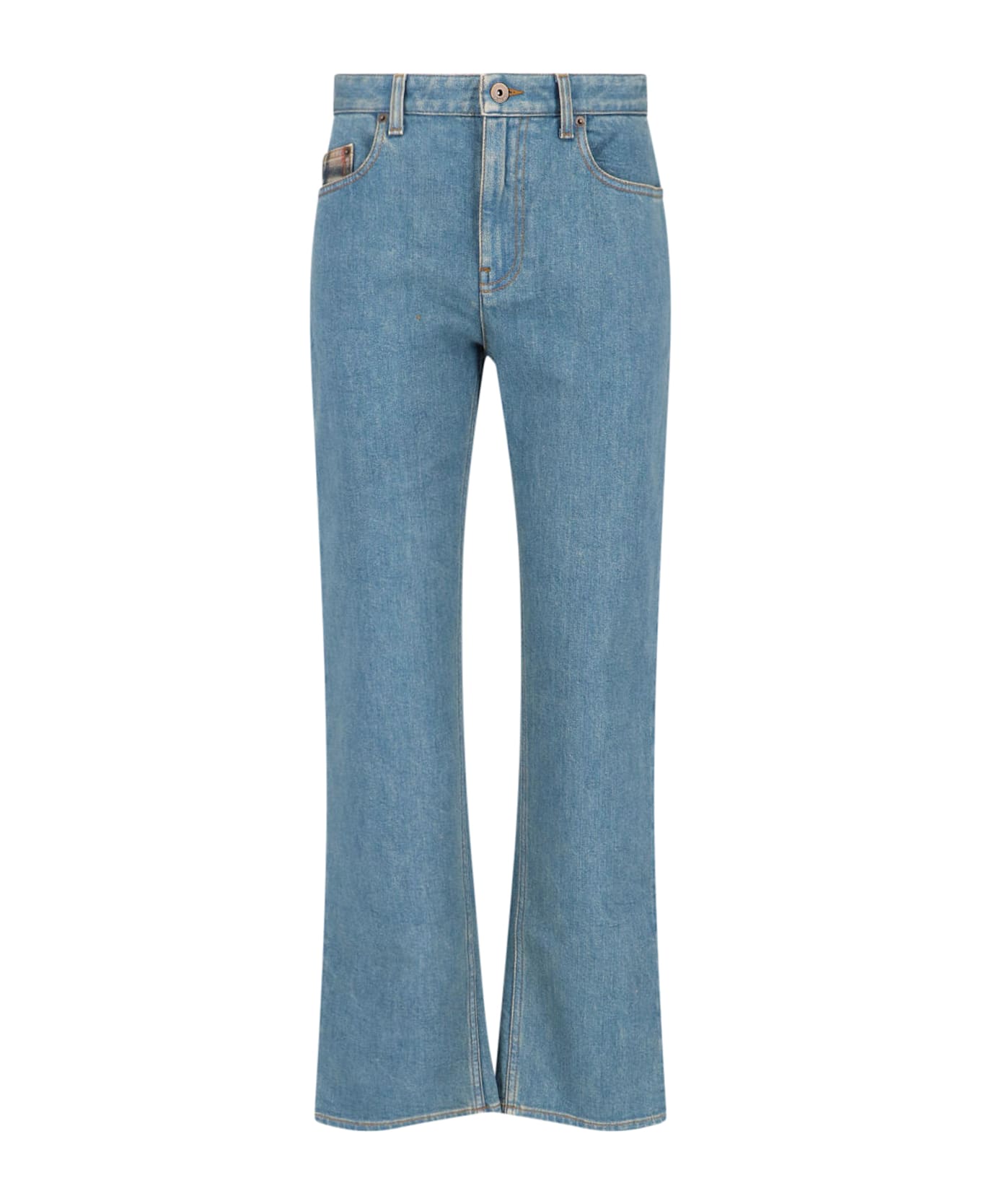 Burberry bootcut jeans in blue cotton denim with mid waist, button and zip closure, belt loops, five pocket design, 'check' detail on the pocket, leather logo tag at the back, straight leg. Composition: 98% Cotton, 2% Elastane