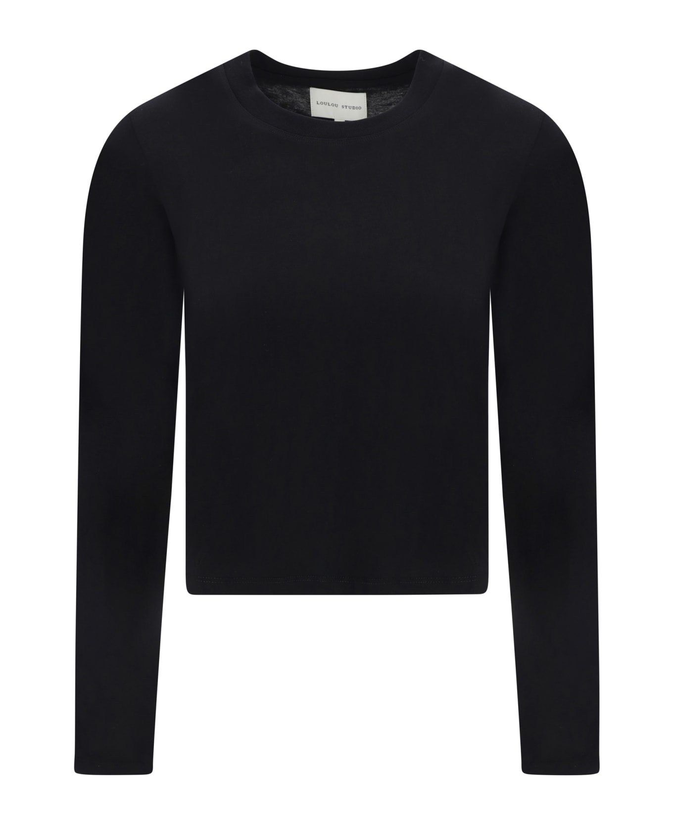 Cotton long sleeve jersey by loulou studio, ribbed crew neck, cropped pattern, monochrome design, iconic embroidered logo on front, oversize fit.