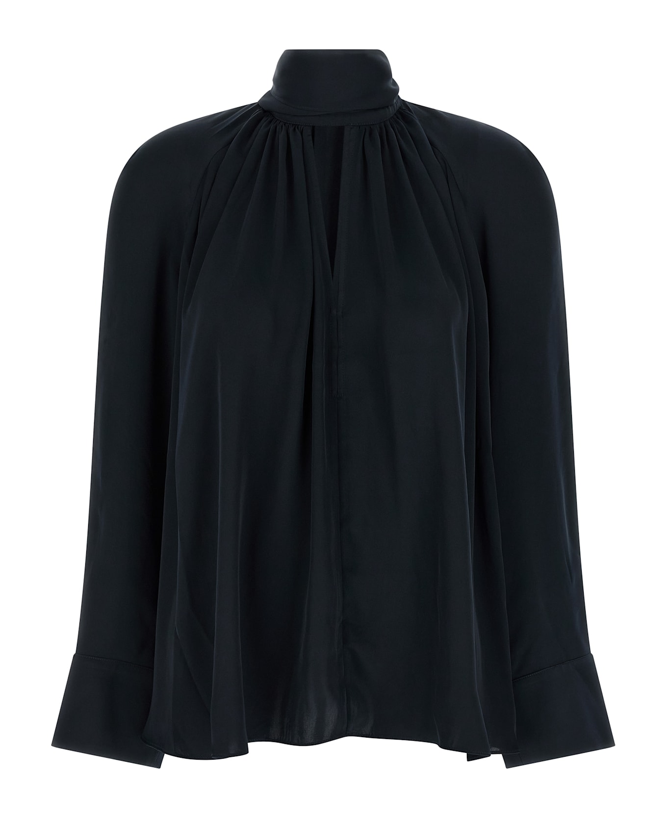 'Satin Bow' blouse in silk-effect fabric with V-neck, sash tied at the neck, back zip closure and logo charm, long sleeves with cuffs.