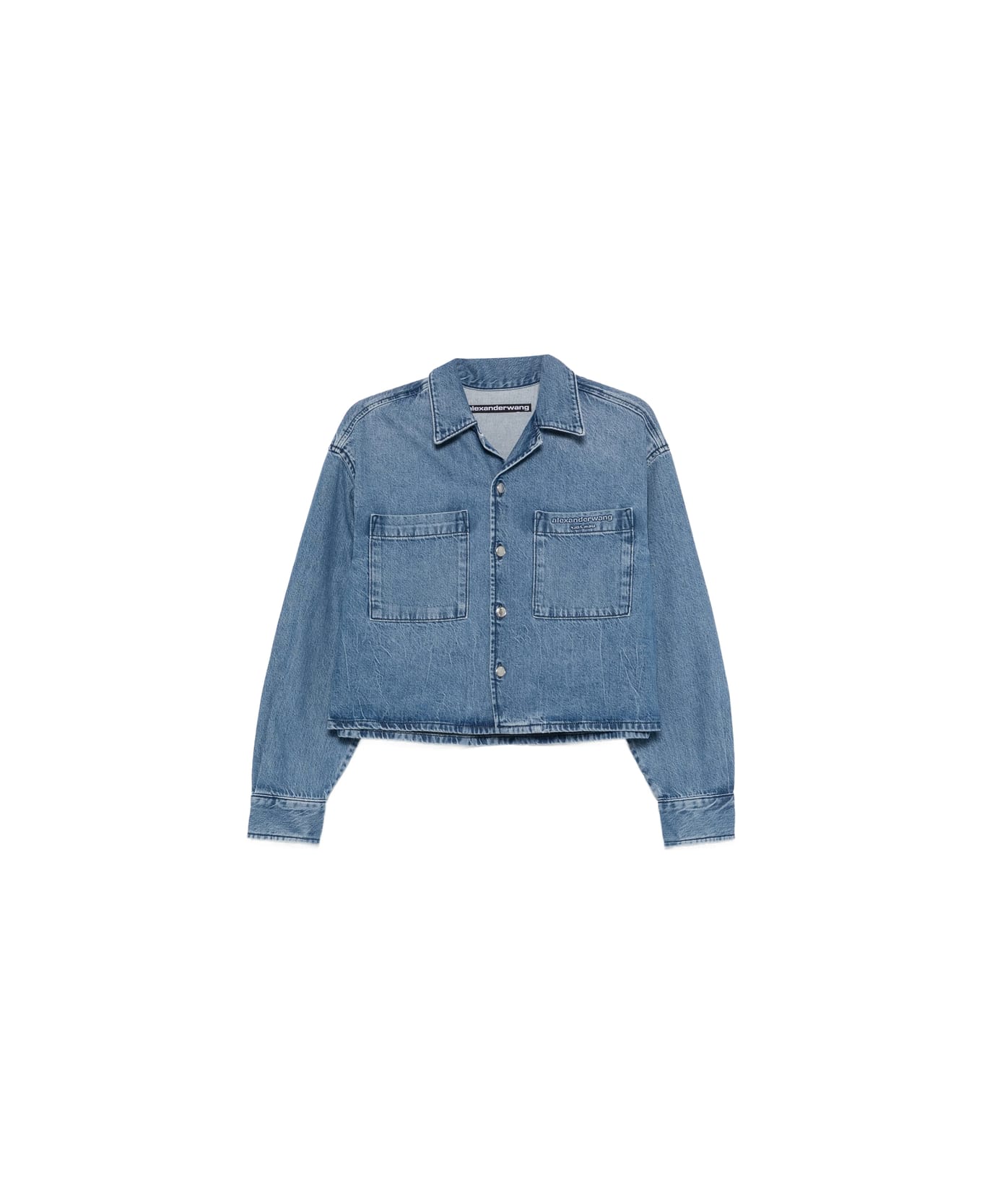 light blue button fastening point collar long sleeves two chest pockets cropped