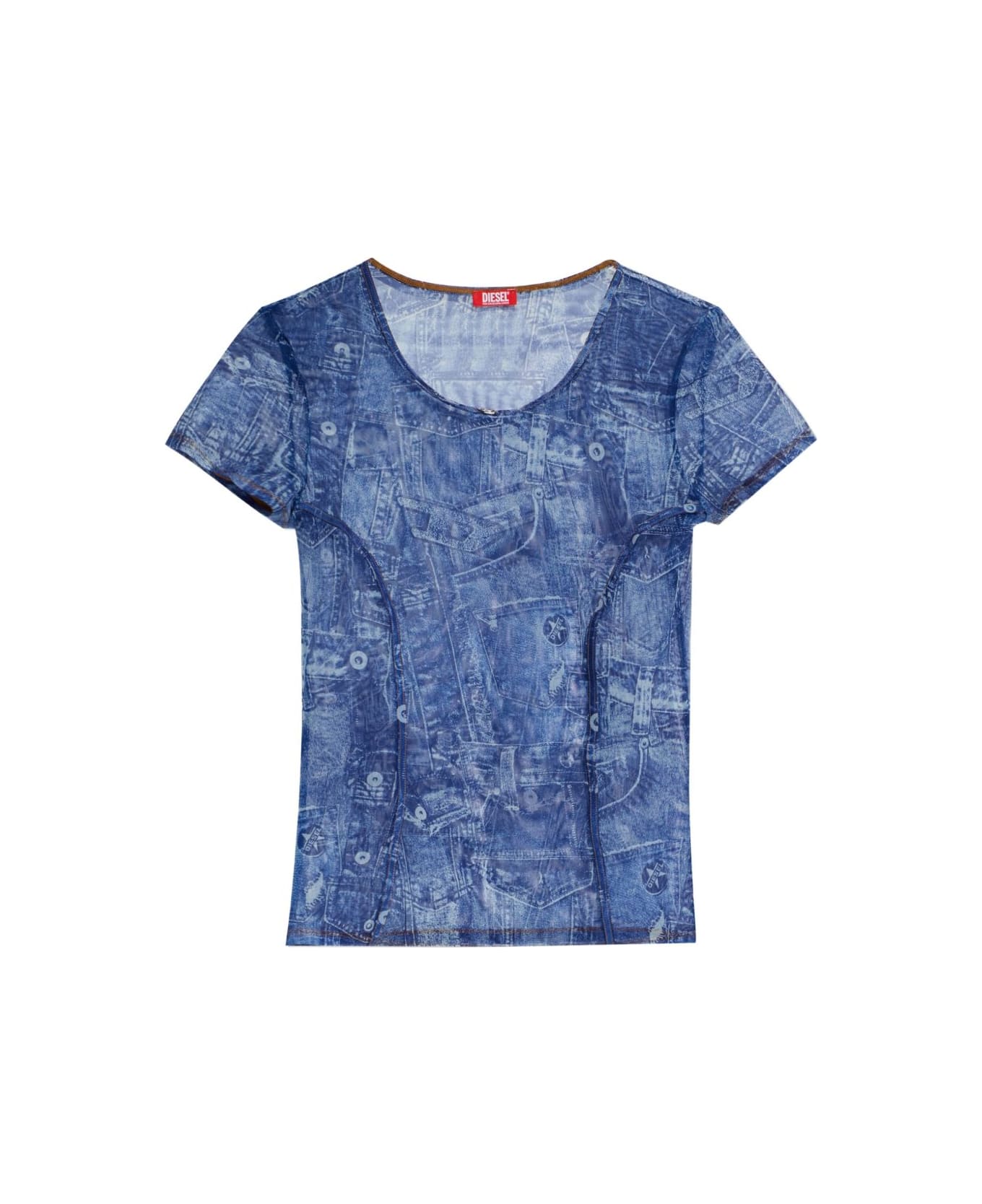 blue denim print short sleeves metal detail round neck seam detail Composition: Synthetic->elastane12. , 0% Synthetic->polyamide88. , 0%