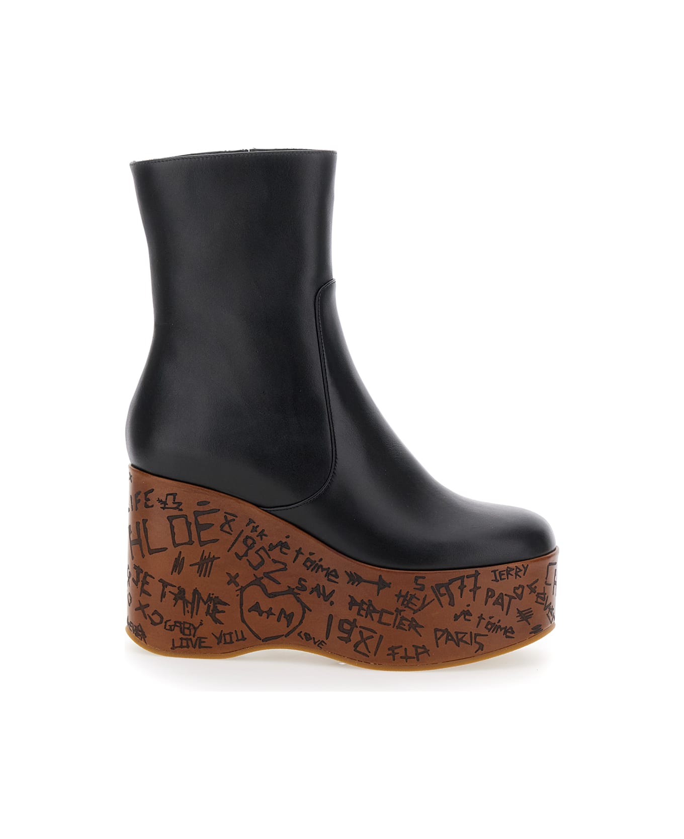 Black Ankle Boots With Wood-effect Platform With Engravings In Leather Woman